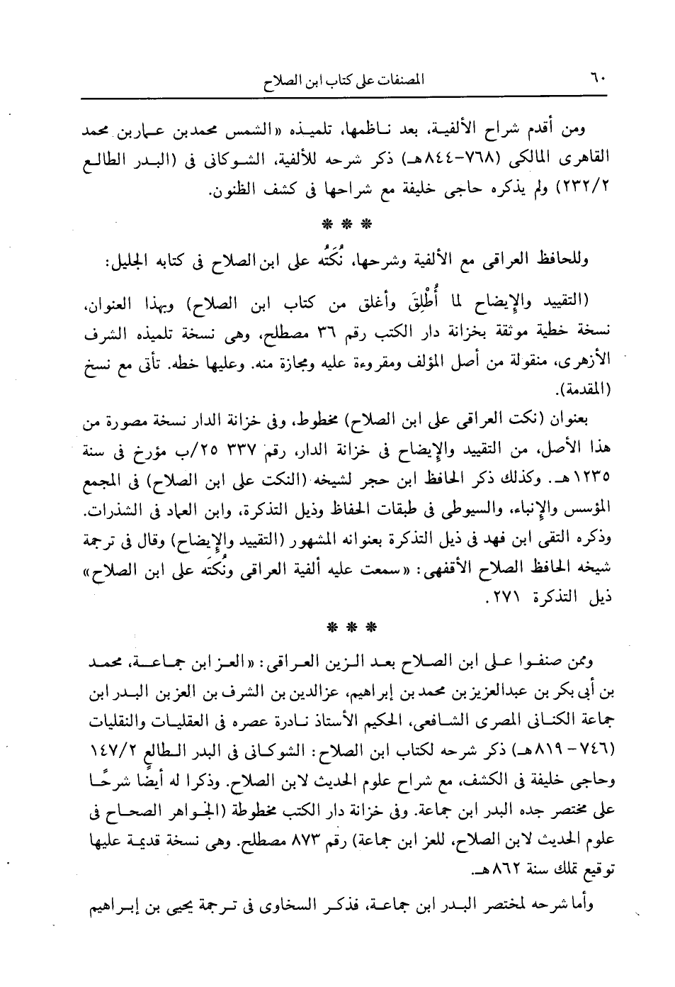 وممن صنفوا على ابن الصلاح بعد الزين العراقي: " العز ابن جماعة، محمد بن أبي بكر بن عبدالعزيز بن محمد بن إبراهيم، عزالدين بن الشرف بن العز بن البدر ابن جماعة الكناني المصري الشافعي، الحكيم الأستاذ نادرة عصره في العقليات والنقليات (746 - 819 هـ) ذكر شرحه لكتاب ابن الصلاح: الشوكاني في البدر الطالع 2/ 147 وحاجي خليفة في الكشف، مع شراح علوم الحديث لابن الصلاح. وذكرا له أيضًا شرحًا على مختصر جده البدر ابن جماعة. وفي خزانة دار الكتب مخطوطة (الجَواهر الصحاح في علوم الحديث لابن الصلاح، للعز ابن جماعة) رقم 873 مصطلح. وهي نسخة قديمة عليها توقيع تملك سنة 862 هـ.