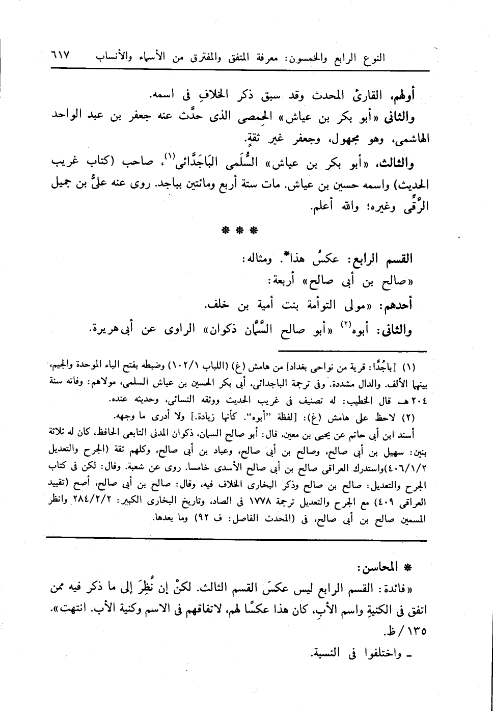 " فائدة: القسم الرابع ليس عكسَ القسم الثالث. لكنْ إن نُظِرَ إلى ما ذكر فيه ممن اتفق في الكنيةِ واسم الأبِ، كان هذا عكسًا لهم؛ لاتفاقهم في الاسم وكنية الأب. انتهت " 135 / ظ.