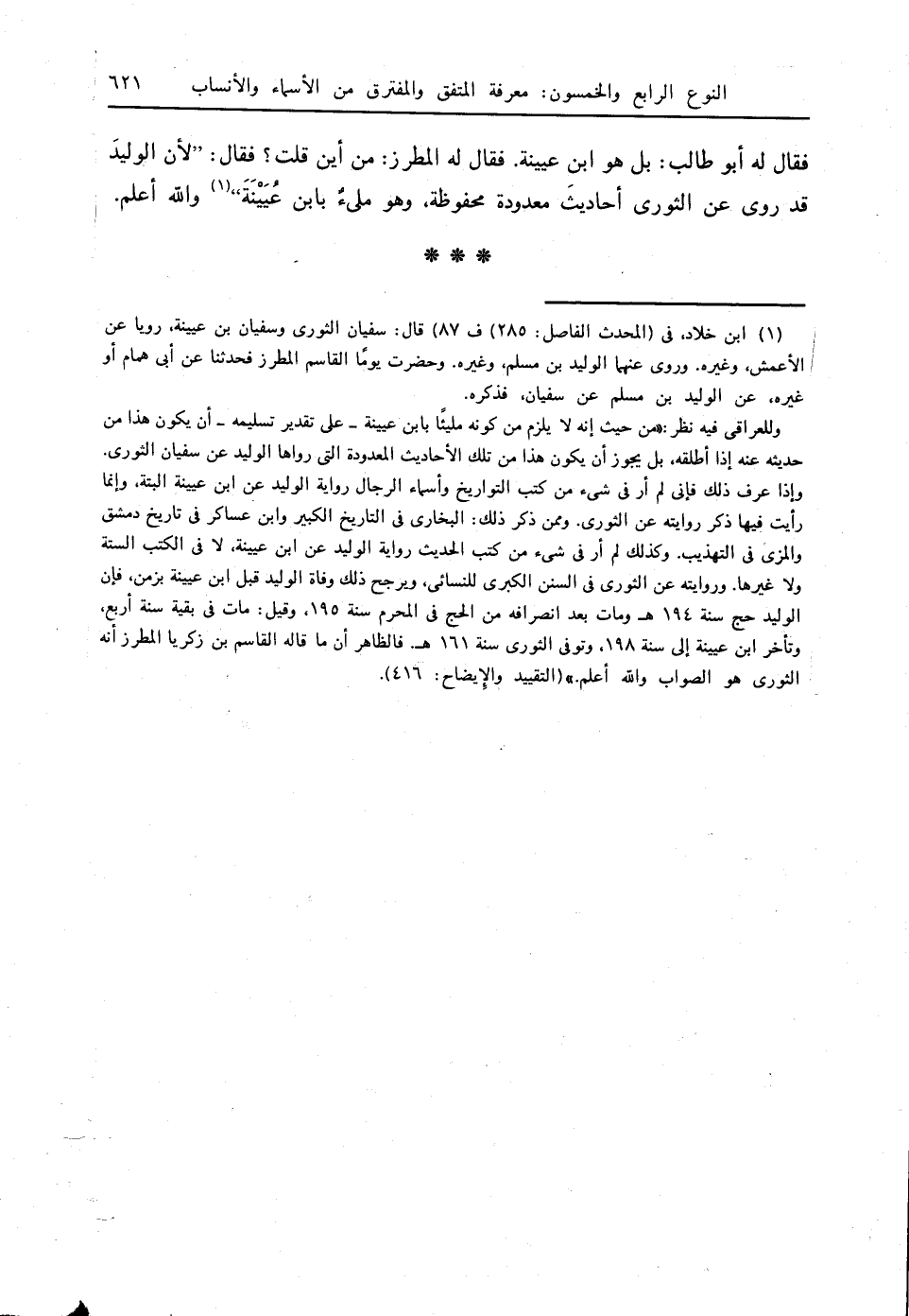 وللعراقي فيه نظر، من حيث إنه لا يلزم من من كونه مليئًا بابن عيينة - على تقدير تسليمه - أن يكون هذا من حديثه عنه إذا أطلقه، بل يجوز أن يكون هذا من تلك الأحاديث المعدودة التي رواها الوليد عن سفيان الثوري. وإذا عرف ذلك فإني لم أر في شيء من كتب التواريخ وأسماء الرجال رواية الوليد عن ابن عيينة البتة، وإنما رأيت فيها ذكر روايته عن الثوري. وممن ذكر ذلك: البخاري في التاريخ الكبير وابن عساكر في تاريخ دمشق والمزي في التهذيب. وكذلك لم أر في شيء من كتب الحديث رواية الوليد عن ابن عيينة، لا في الكتب الستة ولا غيرها. وروايته عن الثوري في السنن الكبرى للنسائي، ويرجح ذلك وفاة الوليد قبل ابن عيينة بزمن؛ فإن الوليد حج سنة 194 هـ ومات بعد انصرافه من الحج في المحرم سنة 195، وقيل: مات في بقية سنة أربع، وتأخر ابن عيينة إلى سنة 198، وتوفي الثوري سنة 161 هـ، فالظاهر أن ما قاله القاسم بن زكريا المطرز أنه الثوري هو الصواب. والله أعلم. " (التقييد والإيضاح: 416).