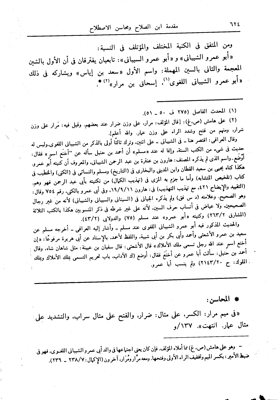 وقال العراي: اقتصر هنا - في الشيباني - على اثنين، وترك ثالثًا أولى بالذكر من الشيباني اللغوي - وليس له حديث في شيء من الكتب الستة، وإنما له عند " مسلم " أن أحمد بن حنبل سأله عن " أخنعَ اسم ٍ " فقال: أوْضَع - واسم الذي لم يذكره المصنف: هارون بن عنترة بن عبدالرحمن الشيباني، والمعروف أن كنيته أبو عمرو. هكذا كناه يحيى بن سعيد القطان وابن المديني والبخاري في (التاريخ) ومسلم والنسائي في (الكنى) والخطيب في كتاب (تلخيص المتشابه) وأما ما جزم به المزي في (تهذيب الكمال) من تكنيته بأبي عبدالرحمن فهو وهم. (التقييد والإيضاح 421، مع تهذيب التهذيب) في: هاورن 11/ 9 / 19، وفي أبي عمرو بالكنى، رقم 754 وقال: وهو الصحيح. وعلامته (د س فق) ولم يذكره الجياني في (السيناني والسيباني والشيباني) لأنه من غير رجال الصحيحين، ولا عياض في أنساب حرف السين؛ لأنه على غير شرطه في ذكر المنسوبين هكذا بالكتب الثلاثة (المشارق 2/ 263) وكنيته " أبو عمرو " عند مسلم (75) والدولابي (2/ 43).