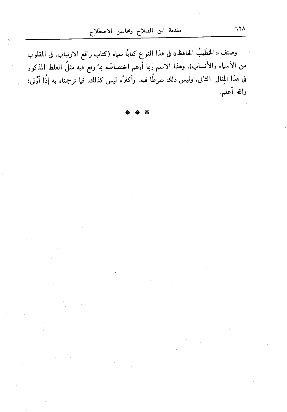 وصنف " الخطيبُ الحافظ " في هذا النوع كتابًا سماه (كتاب رافع الارتياب، في المقلوب من الأسماء والأنساب). وهذا الاسم ربما أوهم اختصاصَه بما وقع فيه مثلُ الغلط المذكور في هذا المِثال ِ الثاني، وليس ذلك شرطًا فيه. وأكثرُه ليس كذلك، فما ترجمناه به إذًا أوْلى. والله أعلم.