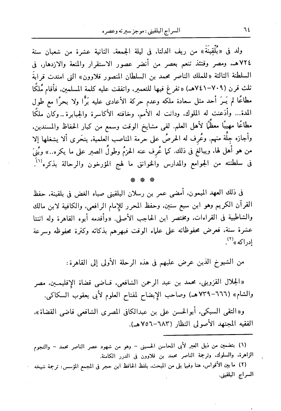 (2) ما بين الأقواس، هنا وفيما يلي من المبحث، بلفظ الحافظ ابن حجر في المجمع المؤسس: ترجمة شيخه السراج البلقيني.