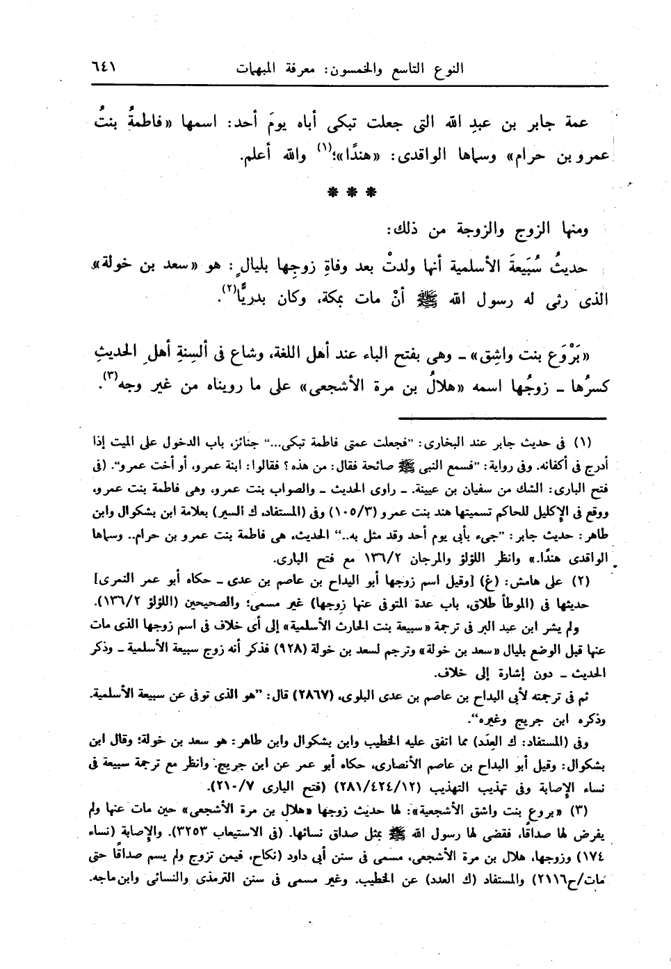 (1) في حديث جابر عند البخاري: " فجعلت عمتي فاطمة تبكي ... " جنائز، باب الدخول على الميت إذا أدرج في أكفانه. وفي رواية: " فسمع النبي - صلى الله عليه وسلم - صائحة فقال: من هذه؟ فقالوا: ابنة عمرو، أو أخت عمرو ". في فتح الباري: الشك من سفيان بن عيينة - راوي الحديث - والصواب بنت عمرو، وهي فاطمة بنت عمرو، ووقع في الإكليل للحاكم تسميتها هند بنت عمرو (3/ 105) وفي (المستفاد، ك السير) بعلامة ابن بشكوال وابن طاهر: حديث جابر: " جيء بأبي يوم أحد وقد مثل به .. " الحديث، هي فاطمة بنت عمرو بن حرام .. وسماها الواقدي هندًا " وانظر اللؤلؤ والمرجان 2/ 136 مع فتح الباري.