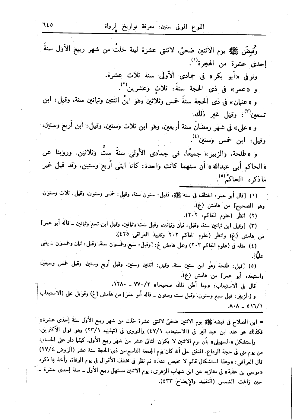 = ابن الصلاح في قبضه - صلى الله عليه وسلم - يوم الاثنين ضحىً لاثنتي عشرة خلت من شهر ربيع الأول سنة إحدى عشرة " فكذلك هو عند ابن عبدالبر في (الاستيعاب 1/ 47) والنووي في (تهذيبه 1/ 23) وهو قول الأكثرين. واستشكل " السهيلي " بأن يوم الاثنين لا يكون الثاني عشر من شهر ربيع الأول، كيفما دار على الحساب من يوم منى في حجة الوداع، المتفق على أنه كان يوم الجمعة التاسع من ذي الحجة سنة عشر (الروض 4/ 27) قال العراقي: " وهذا استشكال قائم لا محيص عنه " ثم نظر في مختلف الأقوال في يوم الوفاة، وأخذ بما ذكره " موسى بن عقبة " في مغازيه عن ابن شهاب الزهري: يوم الاثنين مستهل ربيع الأول - سنة إحدى عشرة - حين زاغت الشمس (التقييد والإيضاح 433).