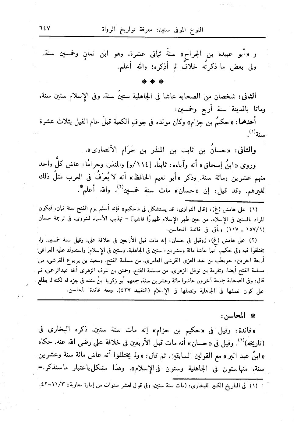 (2) على هامش (غ): [وقيل في حسان: إنه مات قبل الأربعين في خلافة علي، وقيل سنة خمسين. ولم يختلفوا فيه وفي حكيم أنهما عاشا مائة وعشرين: ستين في الجاهلية، وستين في الإسلام] واستدرك عليه العراقي أربعة آخرين: حويطب بن عبدالعزى القرشي العامري، من مسلمة الفتح. وسعيد بن يربوع القرشي، من مسلمة الفتح أيضا. ومخرمة بن نوفل الزهري، من مسلمة الفتح. وحمنن بن عوف الزهري أخا عبدالرحمن، ثم قال: وفي الصحابة جماعة آخرون عاشوا مائة وعشرين سنة، جمعهم أبو زكريا ابنُ منده في جزء له لكنه لم يطلع على كون نصفها في الجاهلية ونصفها في الإسلام (التقييد 427). ومعه فائدة المحاسن.