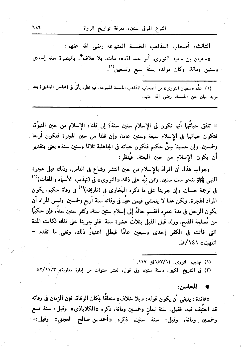 (1) عدُّه " سفيان الثوري " من أصحاب المذاهب الخمسة المتبوعة؛ فيه نظر، يأتي في (محاسن البلقيني) بعد مزيد بيان عن الخمسة - رضي الله عنهم -.