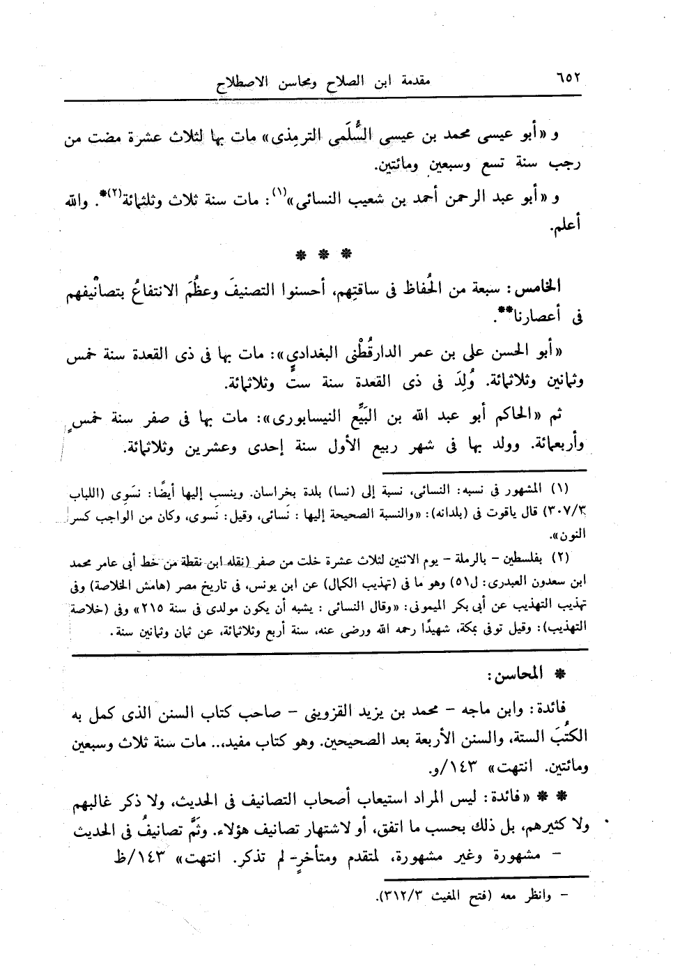 " فائدة: وابن ماجه - محمد بن يزيد القزويني - صاحب كتاب السنن الذي كمل به الكتُبَ الستة، والسنن الأربعة بعد الصحيحين. وهو كتاب مفيد .. مات سنة ثلاث وسبعين ومائتين. انتهت " 143 / و.