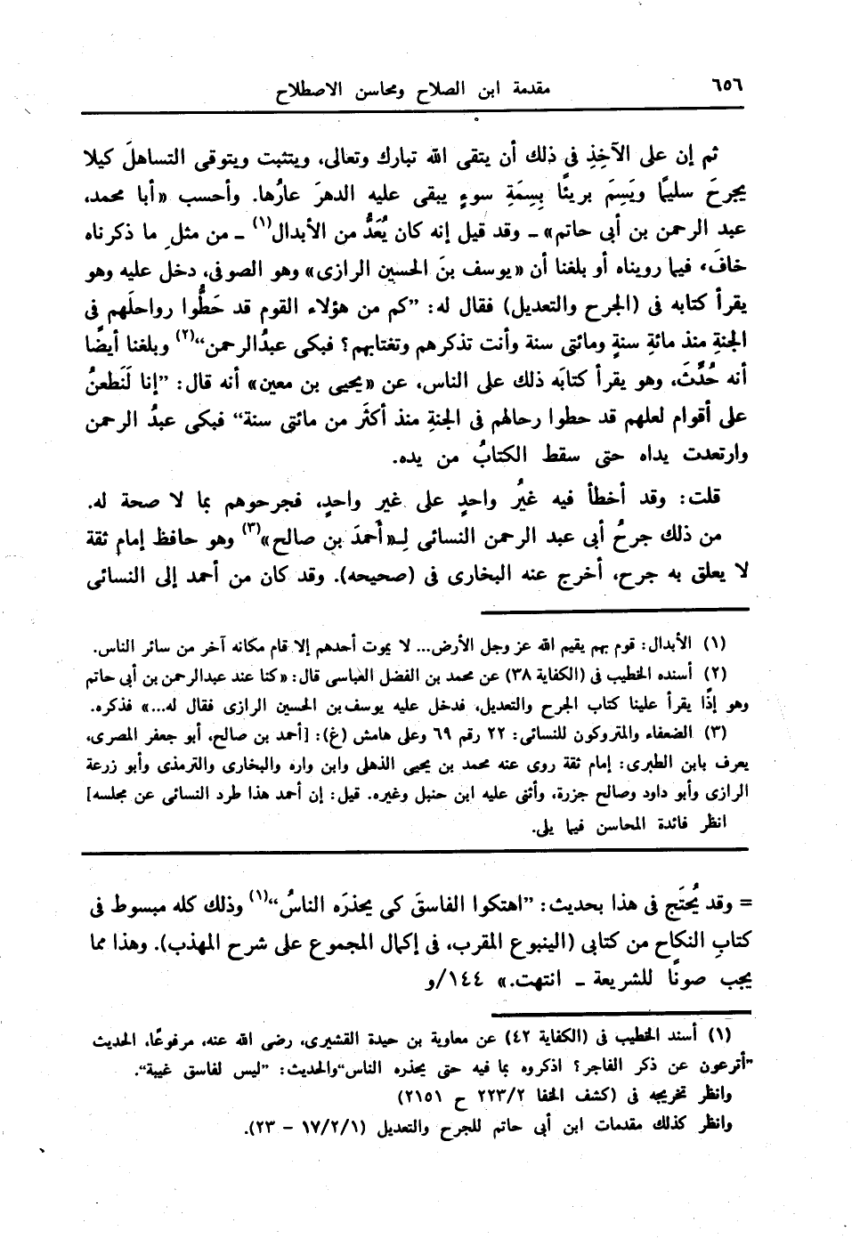 قلت: وقد أخطأ فيه غيرُ واحدٍ على غير واحدٍ، فجرحوهم بما لا صحة له. من ذلك جرحُ أبي عبدالرحمن النسائي لِـ " أحمدَ بن صالح " (3) وهو حافظ إمام ثقة لا يعلق به جرح، أخرج عنه البخاري في (صحيحه). وقد كان من أحمد إلى النسائي