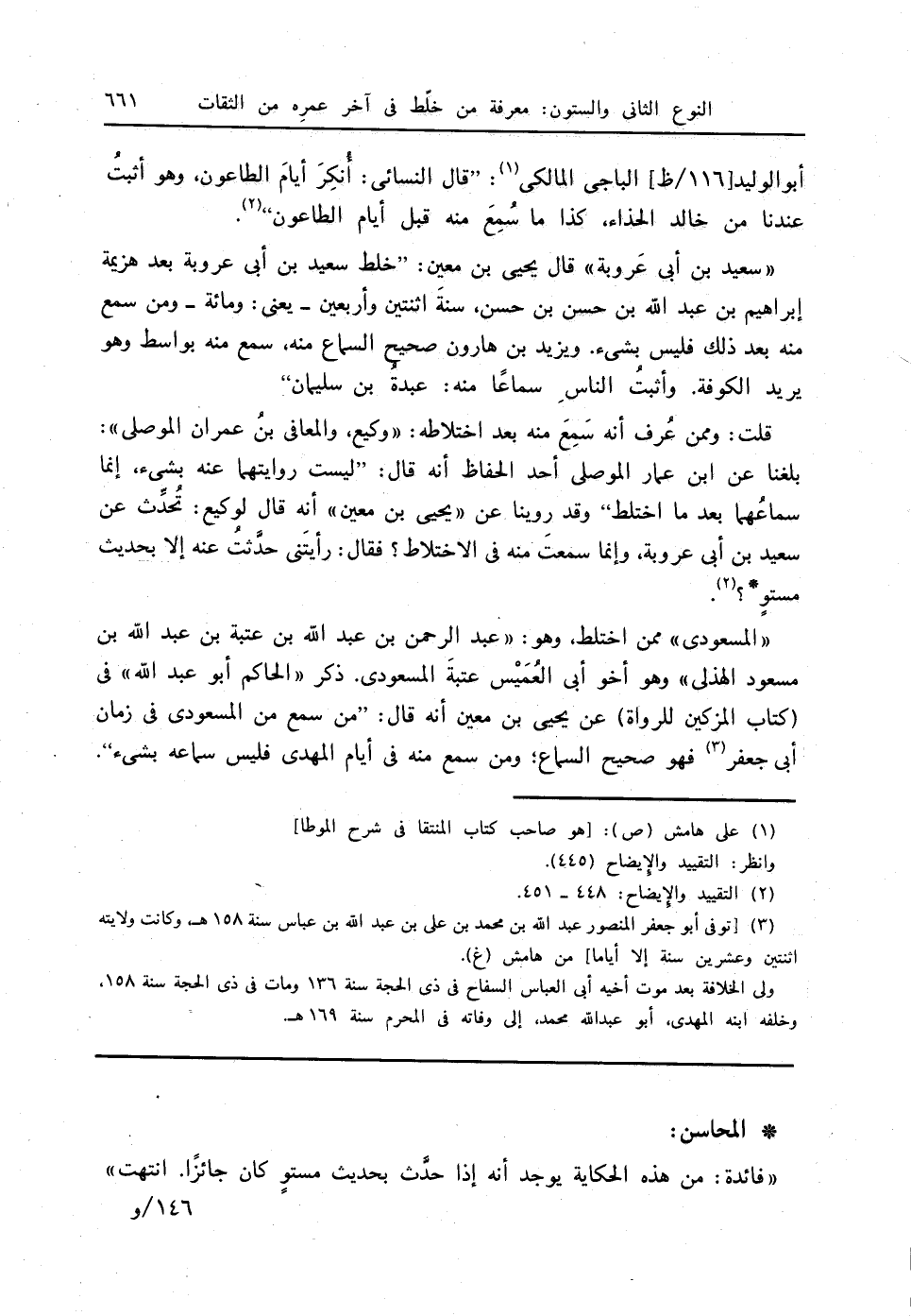 " المسعودي " ممن اختلط، وهو: " عبدالرحمن بن عبدالله بن عتبة بن عبدالله بن مسعود الهذلي " وهو أخو أبي العُمَيْس عتبةَ المسعودي. ذكر " الحاكم أبو عبدالله " في (كتاب المزكين للرواة) عن يحيى بن معين أنه قال: " من سمع من المسعودي في زمان أبي جعفر (3) فهو صحيح السماع، ومن سمع منه في أيام المهدي فليس سماعه بشيء ".