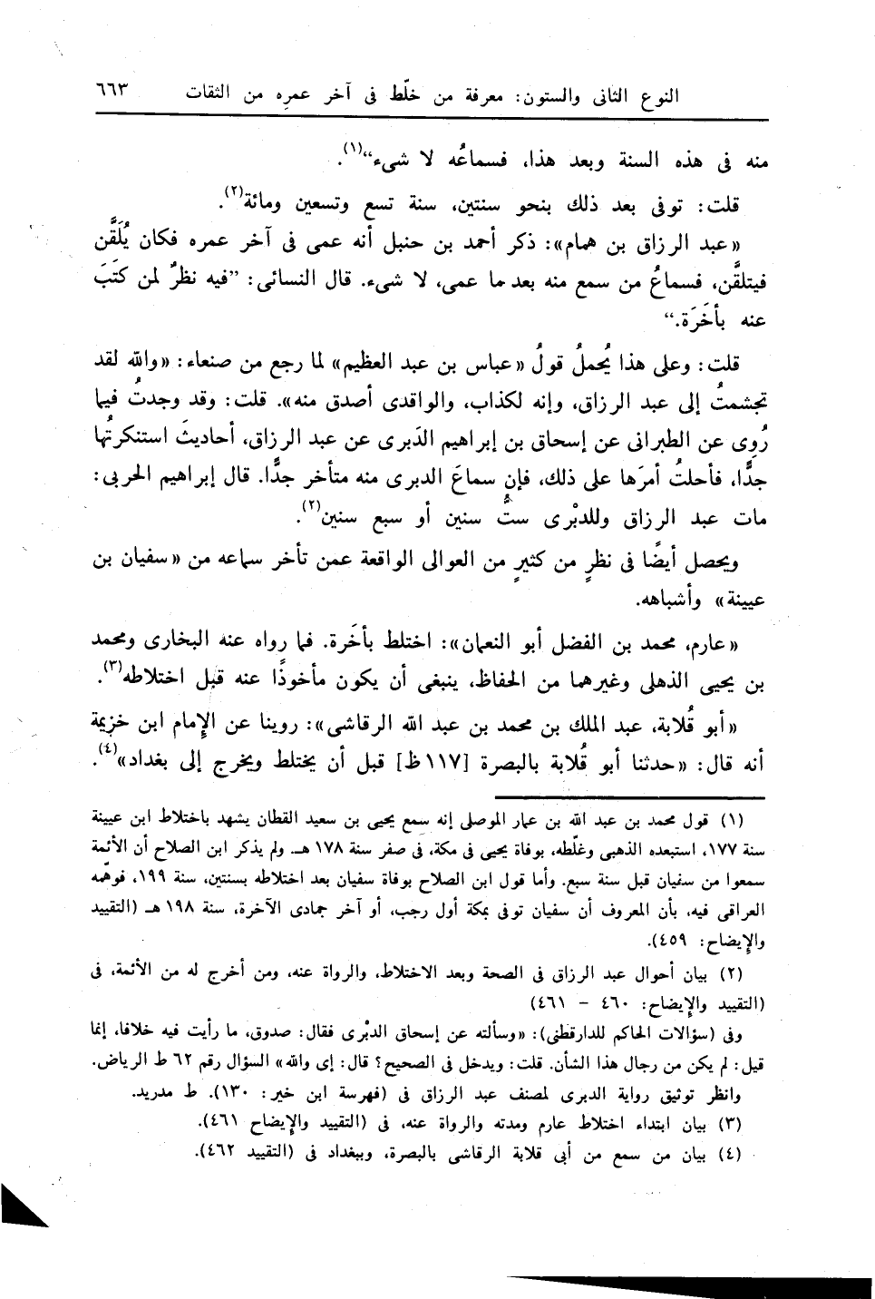 " عبدالرزاق بن همام ": ذكر أحمد بن حنبل أنه عمي في آخر عمره، فكان يُلَقَّن فيتلقَّن، فسماعُ من سمع منه بعد ما عمي، لا شيء. قال النسائي: " فيه نظرٌ لمن كتَبَ عنه بأخَرَة ".
