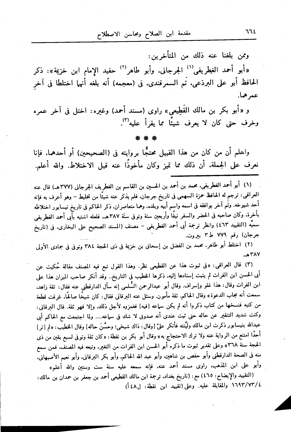 (3) قال العراقي: " في ثبوت هذا عن القطيعي نظر. وهذا القول تبع فيه المصنف مقالة حُكيت عن أبي الحسن ابن الفرات لم يثبت إسنادها إليه، ذكرها الخطيب في التاريخ .. وقد أنكر صاحب الميزان هذا على ابن الفرات وقال: هذا غلو وإسراف. وقال أبو عبدالرحمن السُّلمي إنه سأل الدارقطني عنه فقال: ثقة زاهد، سمعت أنه مجاب الدعوة " وقال الحاكم: ثقة مأمون. وسئل عنه البرقاني فقال: كان شيخًا صالحًا، غرقت قطعة من كتبه فنسخها من كتاب ذكروا أنه لم يكن سماعه [فيه] فغمزوه لأجل ذلك، وإلا فهو ثقة. قال البرقاني: وكنت شديد التنقير عن حاله حتى ثبت عندي أنه صدوق لا شك في سماعه ... ولما اجتمعت مع الحاكم أبي عبدالله بنيسابور ذكرت ابن مالك وليَّنته فأنكر عليّ [وقال: ذاك شيخي، وحسَّنَ حاله] وقال الخطيب: " لم [نر] أحدًا امتنع من الرواية عنه ولا ترك الاحتجاج به " وقال أبو بكر بن نقطة: " كان ثقة وتوفي لسبع بقين من ذي الحجة سنة 368 " وعلى تقدير ثبوت ما ذكره أبو الحسن ابن الفرات من التغير، وتبعه فيه المصنف، فمن سمع منه في الصحة الدارقطني وأبو حفص بن شاهين، وأبو عبدالله الحاكم، وأبو بكر البرقاني، وأبو نعيم الأصبهاني، وأبو علي ابن المذهب، راوي مسند أحمد عنه؛ فإنه سمعه عليه سنة ست وستين. والله أعلم ".