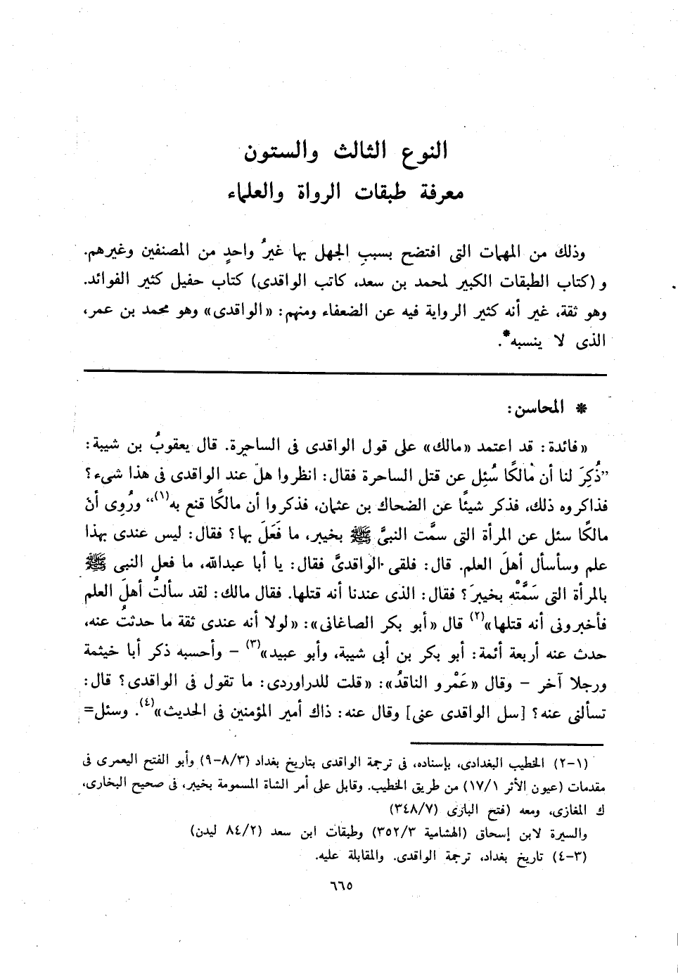 وذلك من المهمات التي افتضح بسببِ الجهل بها غيرُ واحدٍ من المصنفين وغيرهم. و (كتاب الطبقات الكبير لمحمد بن سعد، كاتب الواقدي) كتاب حفيل كثير الفوائد وهو ثقة، غير أنه كثير الرواية فيه عن الضعفاء ومنهم: " الواقدي " وهو محمد بن عمر، الذي لا ينسبه *.