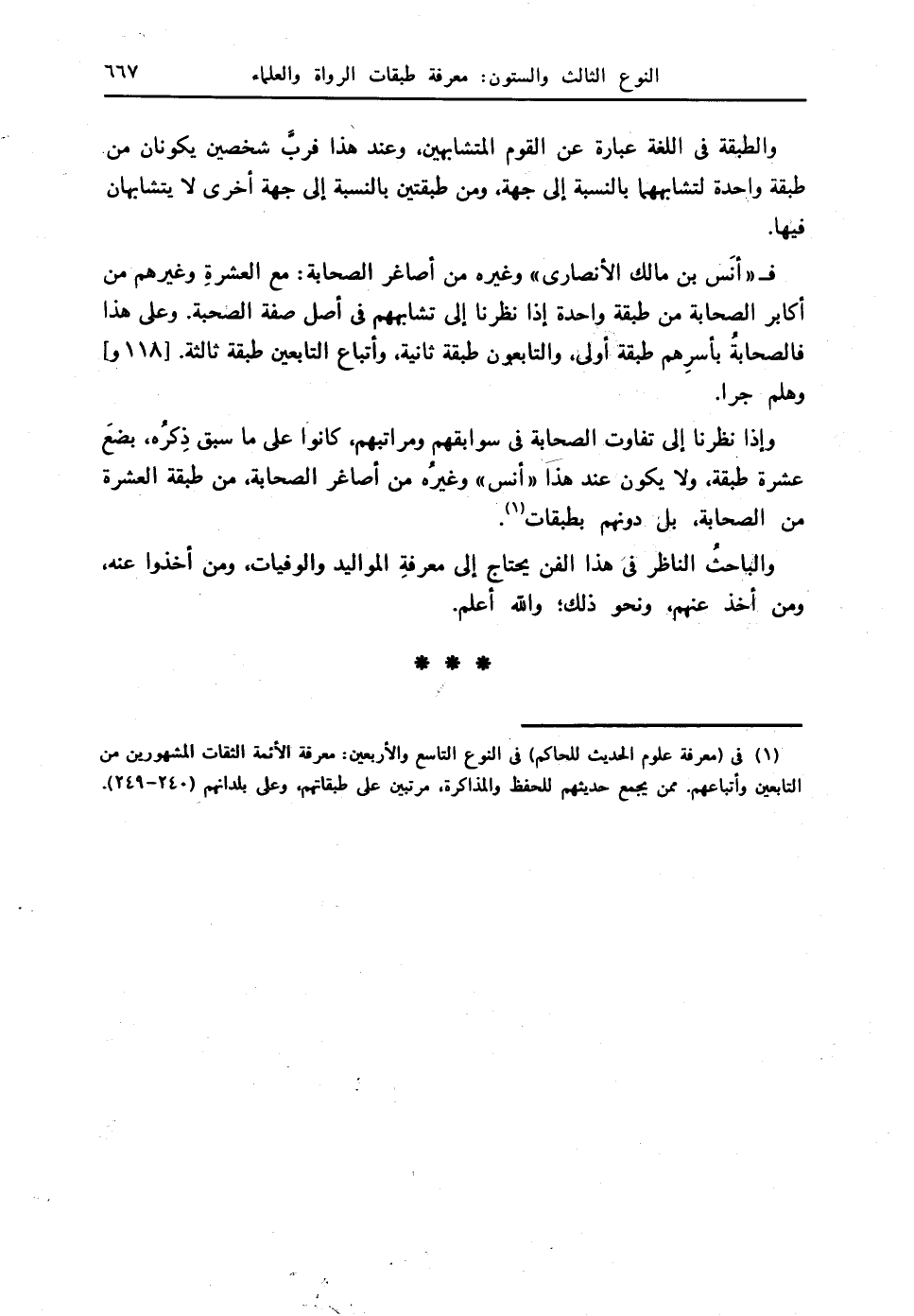 فـ " أنَس بن مالك الأنصاري " وغيره من أصاغر الصحابة: مع العشرةِ وغيرهم من أكابر الصحابة من طبقة واحدة إذا نظرنا إلى تشابههم في أصل صفة الصحبة. وعلى هذا فالصحابةُ بأسرِهم طبقة أولى، والتابعون طبقة ثانية، وأتباع التابعين طبقة ثالثة. [118 و] وهلم جرا.
