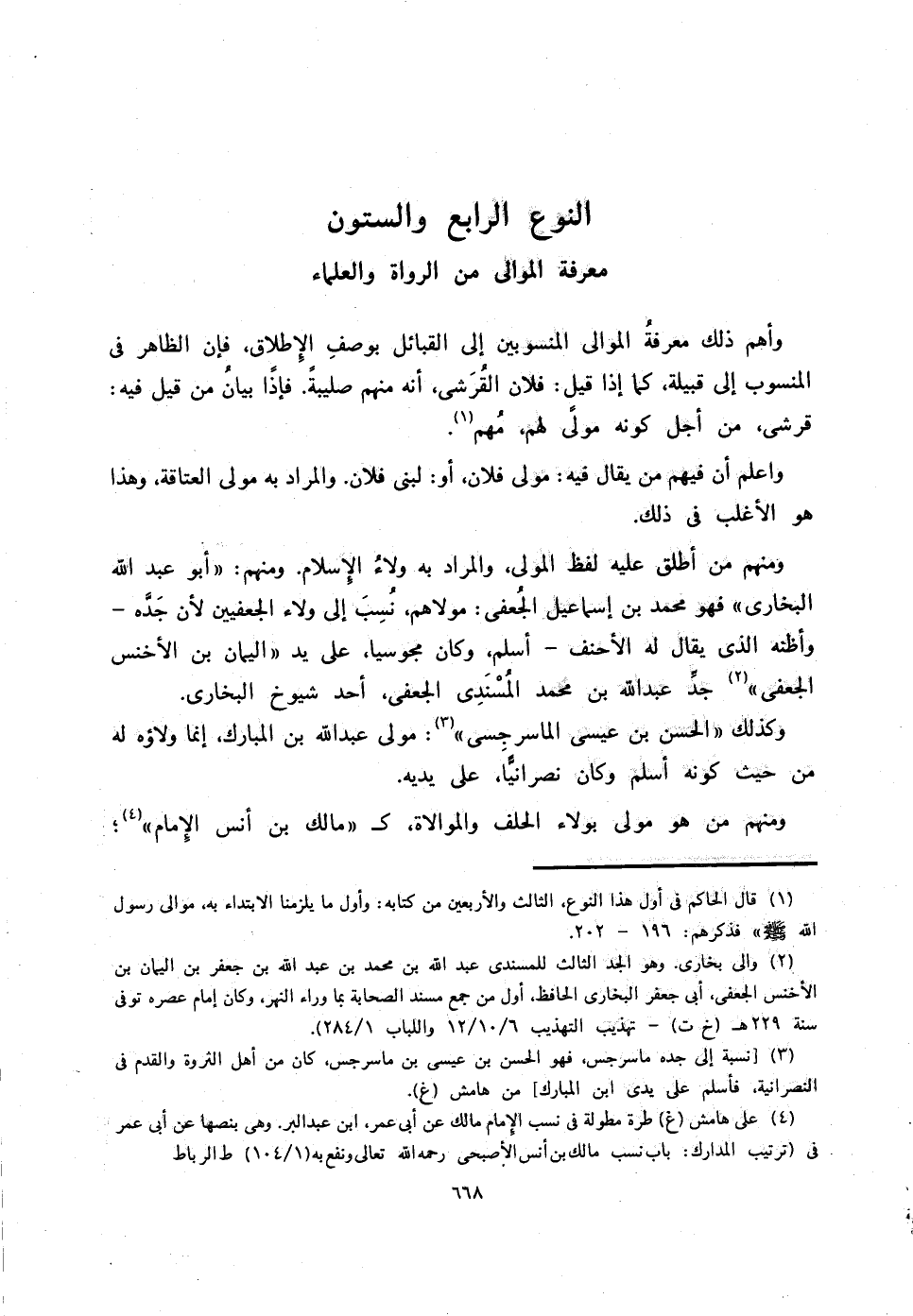ومنهم من أطلق عليه لفظ المولى، والمراد به ولاءُ الإسلام. ومنهم: " أبو عبدالله البخاري " فهو محمد بن إسماعيل الجُعفي: مولاهم، نُسِبَ إلى ولاء الجعفيين لأن جَدَّه - وأظنه الذي يقال له الأحنف - أسلم، وكان مجوسيا، على يد " اليمان بن الأخنس الجعفي " (2) جدِّ عبدالله بن محمد المُسْنَدِي الجعفي، أحد شيوخ البخاري.