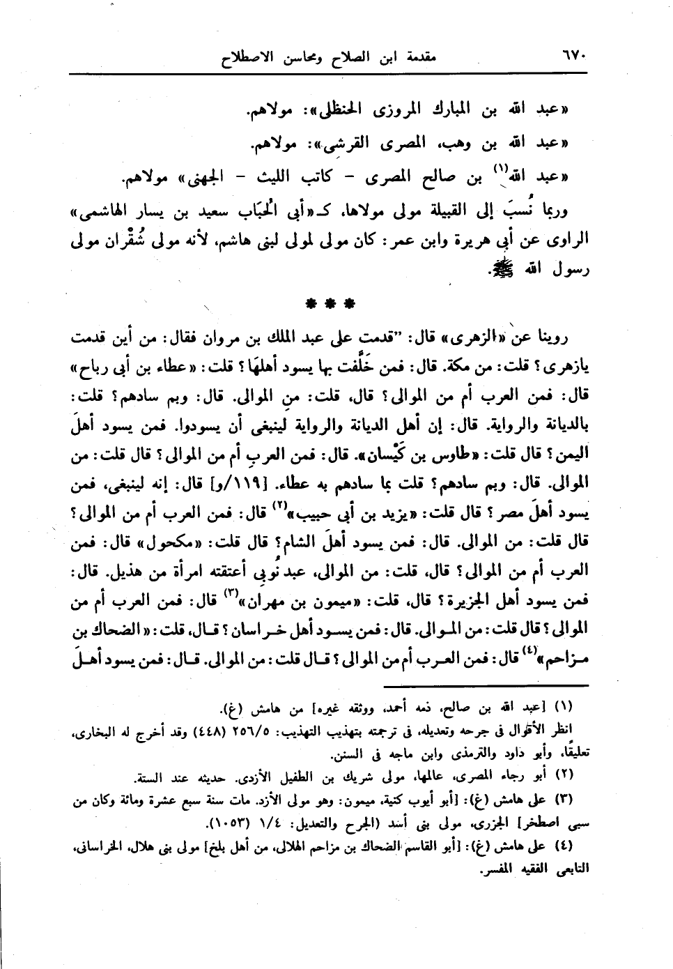 روينا عن " الزهري " قال: " قدمت على عبدالملك بن مروان فقال: من أين قدمت يا زهري؟ قلت: من مكة. فقال: فمن خَلَّفت بها يسود أهلهَا؟ قلت: " عطاء بن أبي رباح " قال: فمن العرب أم من الموالي؟ قال: قلت: من الموالي. قال: وبم سادهم؟ قلت: بالديانة والرواية. قال: إن أهل الديانة والرواية لينبغي أن يسودوا. فمن يسود أهلَ اليمن؟ قال: قلت: " طاوس بن كَيْسان ". قال: فمن العربِ أم من الموالي؟ قال: قلت: من الموالي. قال: وبم سادهم؟ قلت: بما سادهم به عطاء. [119 / و] قال: إنه لينبغي، فمن يسود أهلَ مصر؟ قال: قلت: " يزيد بن أبي حبيب " (2) قال: فمن العرب أم من الموالي؟ قال: قلت: من الموالي. قال: فمن يسود أهلَ الشام ِ؟ قال: قلت: " مكحول ". قال: فمن العرب أم من الموالي؟ قال: قلت: من الموالي، عبد نُوبِي أعتقته امرأة من هذيل. قال: فمن يسود أهل الجزيرة؟ قال: قلت: " ميمون بن مهران " (3). قال: فمن العرب أم من الموالي؟ قال: قلت: من الموالي. قال: فمن يسود أهل خراسان؟ قال: قلت: " الضحاك بن مزاحم " (4). قال: فمن العرب أم من الموالي؟ قال: قلت: من الموالي. قال: فمن يسود أهلَ