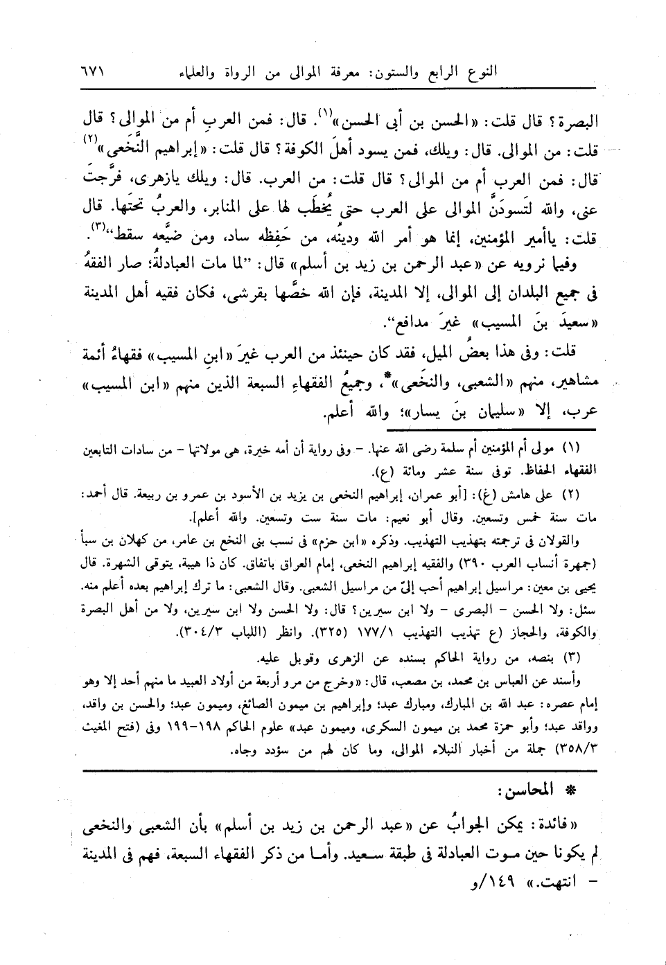 وأسند العباس بن محمد، بن مصعب، قال: " وخرج من مرو أربعة من أولاد العبيد ما منهم أحد إلا وهو إمام عصره: عبدالله بن المبارك، ومبارك عبد، وإبراهيم بن ميمون الصائغ، وميمون عبد، والحسن بن واقد، وواقد عبد، وأبو حمزة محمد بن ميمون السكري، وميمون عبد " علوم الحاكم 198 - 199 وفي (فتح المغيث 3/ 358) جملة من أخبار النبلاء الموالي، وما كان لهم من سؤدد وجاه.