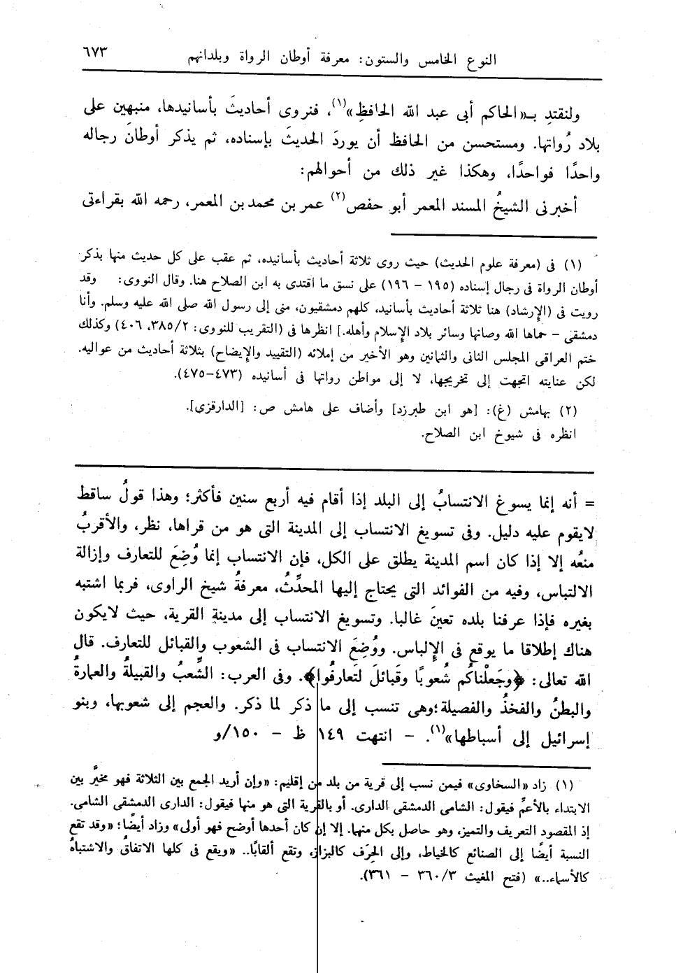 (1) في (معرفة علوم الحديث) حيث روى ثلاثة أحاديث بأسانيده، ثم عقب على كل حديث منها بذكر أوطان الرواة في رجال إسناده (195 - 196) على نسق ما اقتدى به ابن الصلاح هنا. وقال النووي: وقد رويت في (الإرشاد) هنا ثلاثة أحاديث بأسانيد، كلهم دمشقيون، مني إلى رسول الله - صلى الله عليه وسلم -. وأنا دمشقي - حماها الله وصانها وسائر بلاد الإسلام وأهله -.] انظرها في (التقريب للنووي: 2/ 385، 406) وكذلك ختم العراقي المجلس الثاني والثمانين وهو الأخير من إملائه (التقييد والإيضاح) بثلاثة أحاديث من عواليه. لكن عنايته اتجهت إلى تخريجها، لا إلى مواطن رواتها في أسانيده (473 - 475).