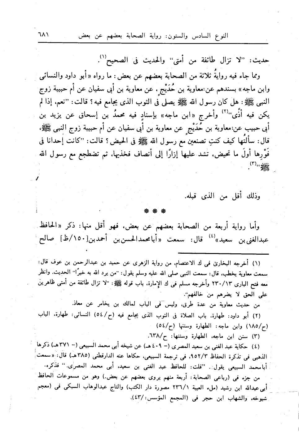 مما جاء فيه روايةُ ثلاثة من الصحابة بعضهم عن بعض: ما رواه " أبو داود، والنسائي، وابن ماجه " بسندهم عن: معاوية بن حُدَيْج ٍ، عن معاوية بن أبي سفيان عن أم حبيبة زوج النبي - صلى الله عليه وسلم -: هل كان رسول الله - صلى الله عليه وسلم - يصلي في الثوب الذي يجامع فيه؟ قالت: " نعم، إذا لم يكن فيه أذًى " (2) وأخرج " ابن ماجه " بإسنادٍ فيه محمدُ بن إسحاق عن يزيد بن أبي حبيب عن: معاوية بن حُدَيْج ٍ عن معاوية بن أبي سفيان عن أم حبيبة زوج النبي - صلى الله عليه وسلم -، قال: سألتُها كيف كنتِ تصنعين مع رسول الله - صلى الله عليه وسلم - في الحيض؟ قالت: " كانت إحدانا في فَوْرِها أولَ ما تحيض، تشد عليها إزارًا إلى أنصاف فخذيها، ثم تضطجع مع رسول الله - صلى الله عليه وسلم - " (3).