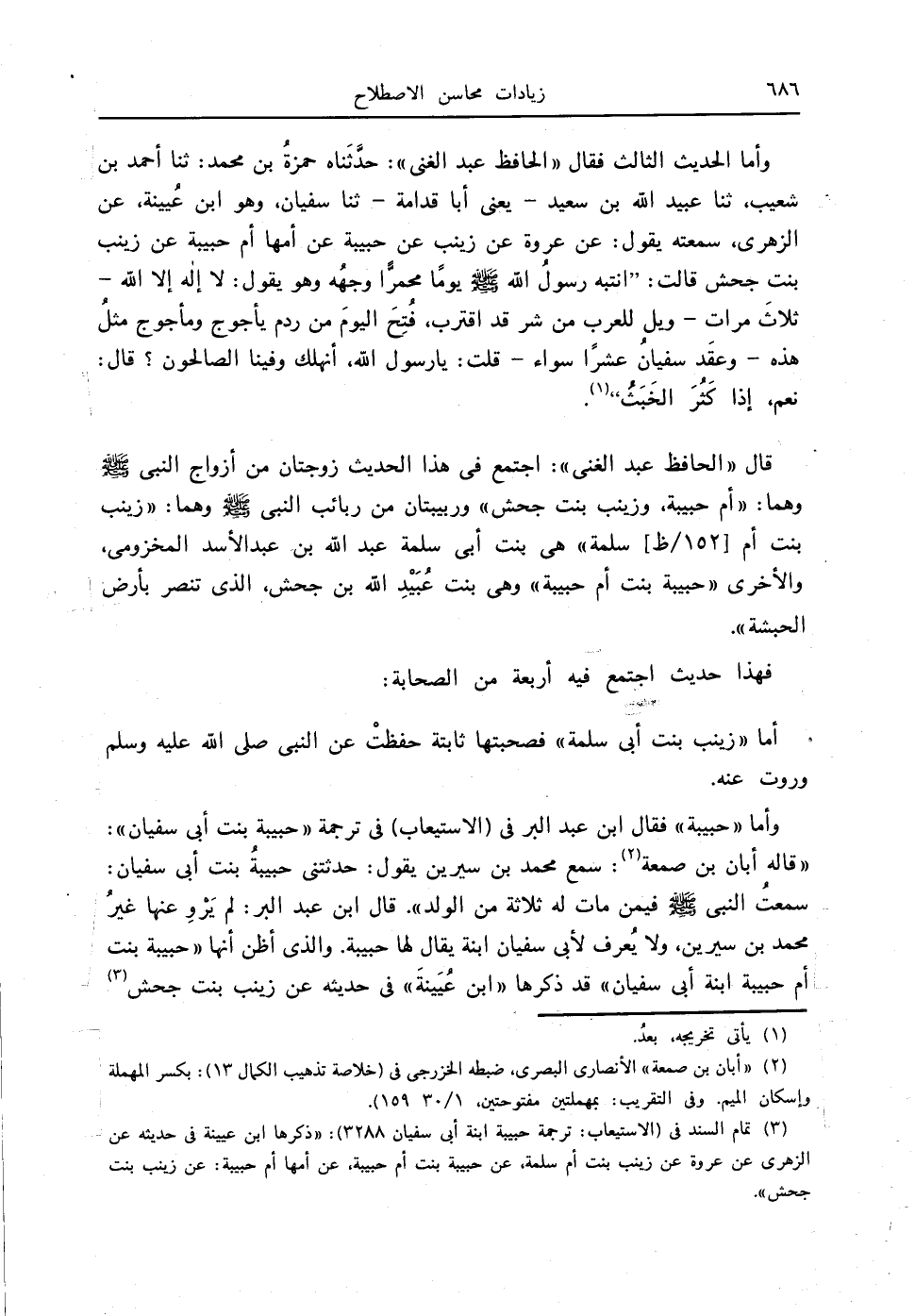 (3) تمام السند في (الاستيعاب: ترجمة حبيبة ابنة أبي سفيان 3288): " ذكرها ابن عيينة في حديثه عن الزهري عن عروة عن زينب بنت أم سلمة، عن حبيبة بنت أم حبيبة، عن أمها أم حبيبة: عن زينب بنت جحش ".