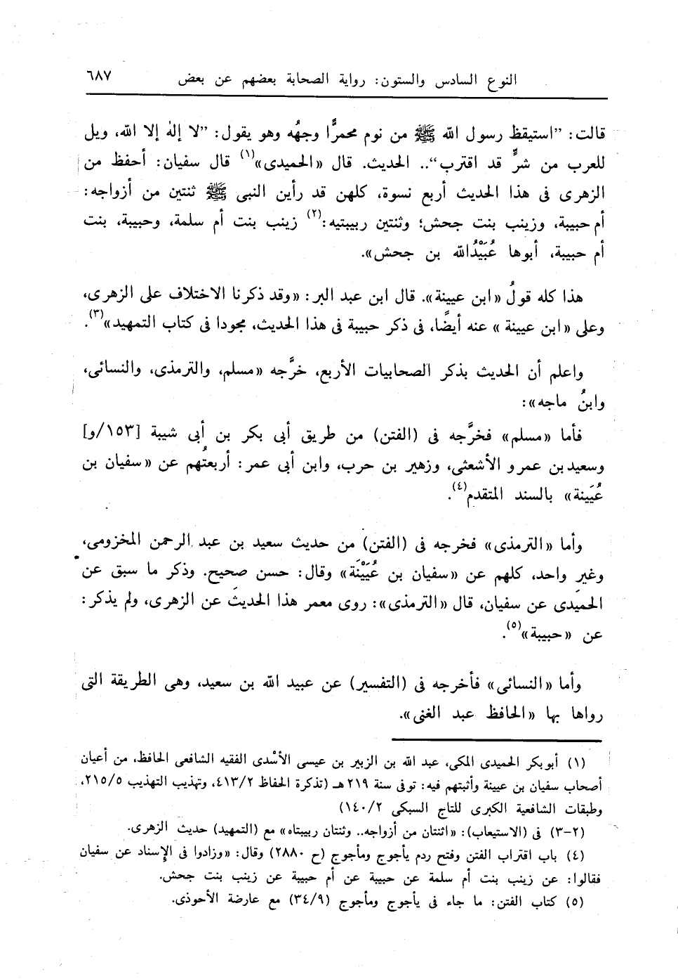 هذا كله قولُ " ابن عيينة ". قال ابن عبدالبر: " وقد ذكرنا الاختلاف على الزهري، وعلى " ابن عيينة " عنه أيضًا، في ذكر حبيبة في هذا الحديث، مجودا في كتاب التمهيد " (3).