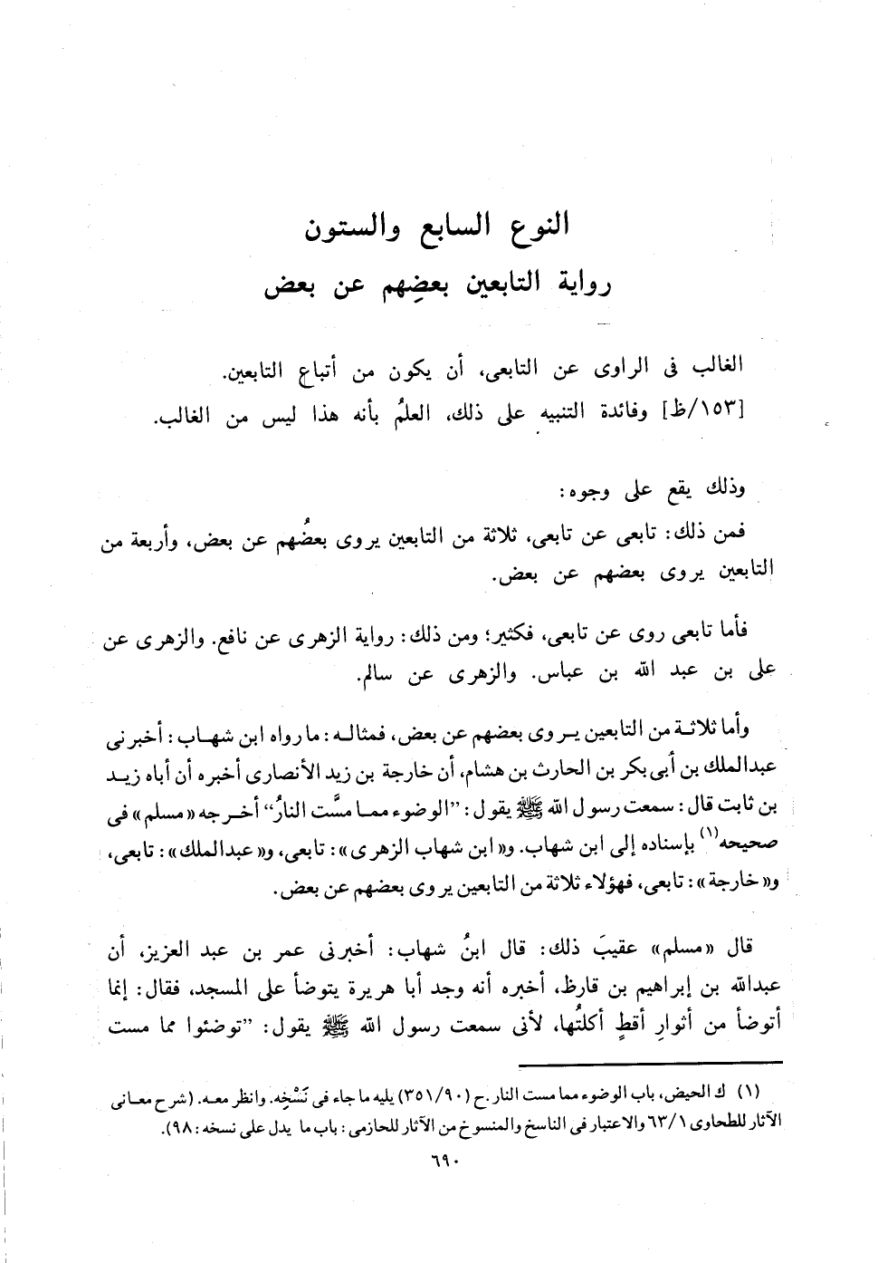 وأما ثلاثة من التابعين يروي بعضهم عن بعض، فمثاله: ما رواه ابن شهاب: أخبرني عبدالملك بن أبي بكر بن الحارث بن هشام، أن خارجة بن زيد الأنصاري أخبره أن أباه زيد بن ثابت قال: سمعت رسول الله - صلى الله عليه وسلم - يقول: " الوضوء مما مست النارُ " أخرجه " مسلم " في صحيحه (1) بإسناده إلى ابن شهاب. و " ابن شهاب الزهري ": تابعي، و " عبدالملك ": تابعي، و " خارجة ": تابعي، فهؤلاء ثلاثة من التابعين يروي بعضهم عن بعض.