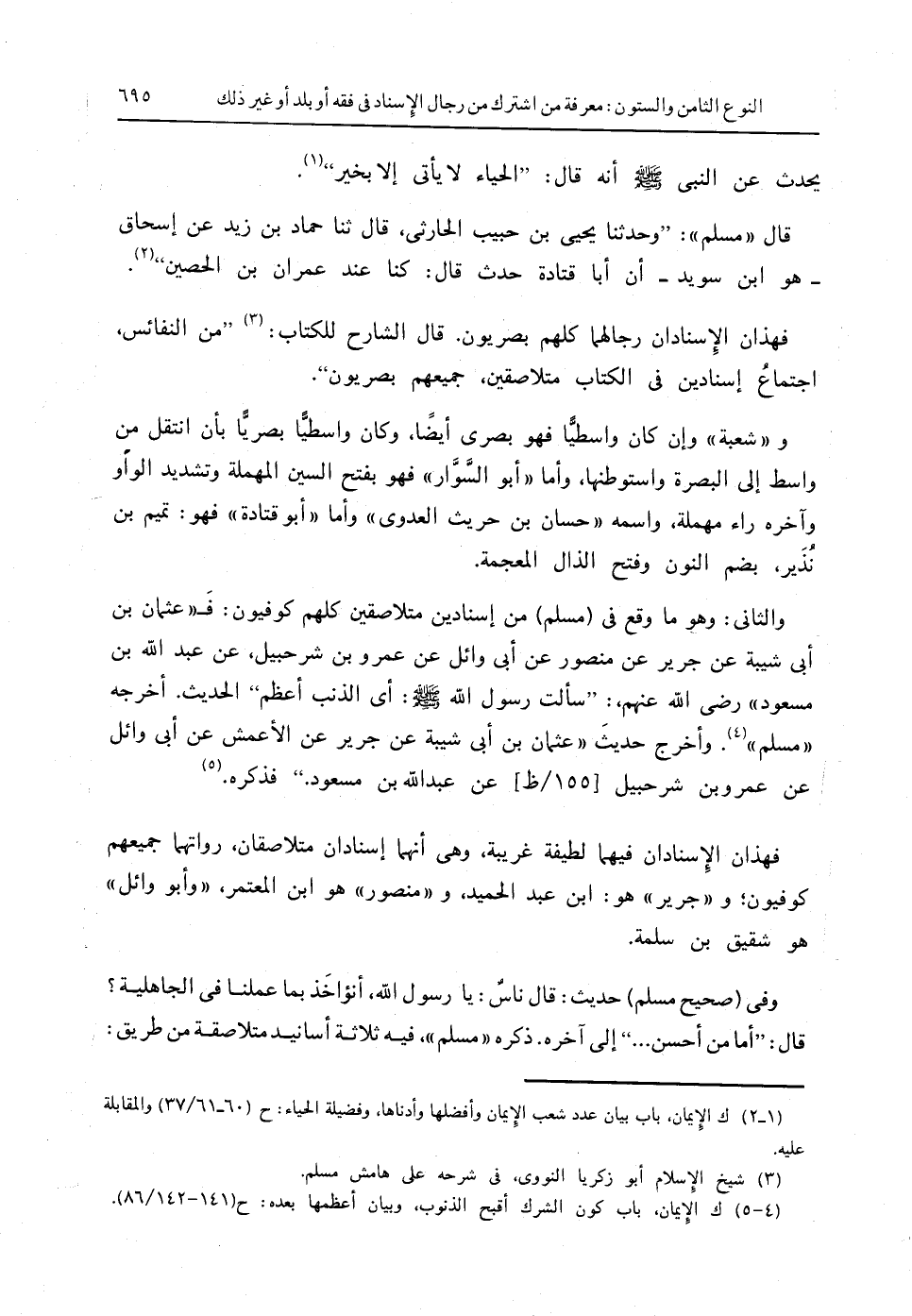 فهذان الإسنادان رجالهما كلهم بصريون. قال الشارح للكتاب: (3) " من النفائس، اجتماعُ إسنادين في الكتاب متلاصقين، جميعهم بصريون ".