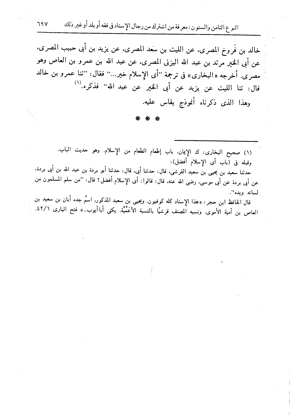خالد بن فَروخ المصري، عن الليث بن سعد المصري، عن يزيد بن أبي حبيب المصري، عن أبي الخير مرثد بن عبدالله اليزني المصري، عن عبدالله بن عمرو بن العاص وهو مصري. أخرجه " البخاري " في ترجمة " أي الإسلام خير ... " فقال: " ثنا عمرو بن خالد قال: ثنا الليث عن يزيد عن أبي الخير عن عبدالله " فذكره (1).