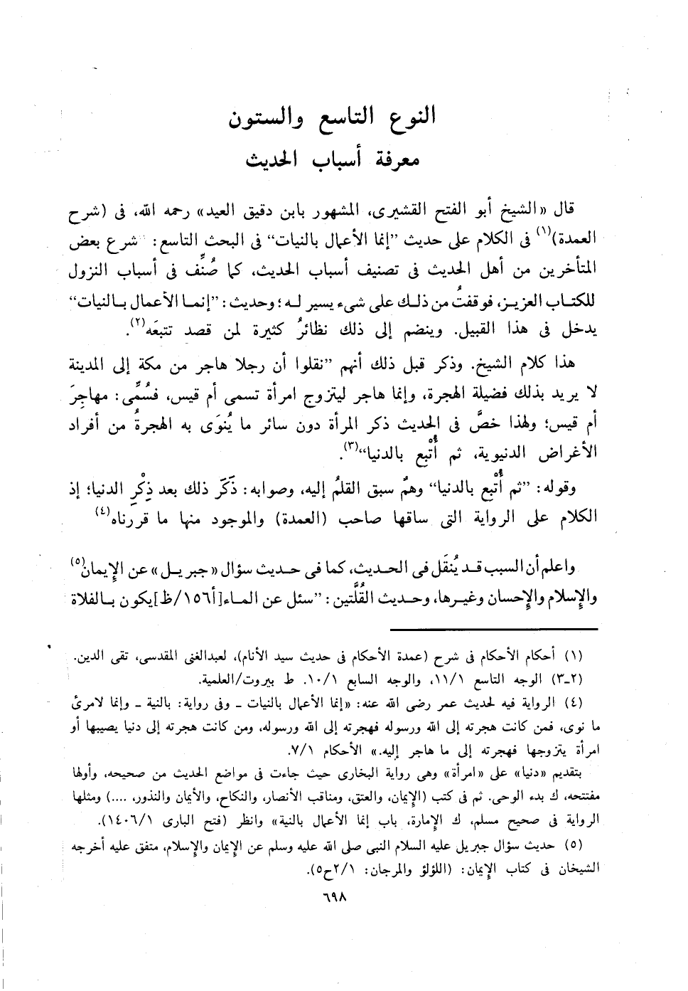 قال " الشيخ أبو الفتح القشيري، المشهور بابن دقيق العيد " - رحمه الله -، في (شرح العمدة) (1) في الكلام على حديث " إنما الأعمال بالنيات " في البحث التاسع: شرع بعض المتأخرين من أهل الحديث في تصنيف أسباب الحديث، كما صُنِّف في أسباب النزول للكتاب العزيز، فوقفتُ من ذلك على شيء يسير له، وحديث: " إنما الأعمال بالنيات " يدخل في هذا القبيل، وينضم إلى ذلك نظائرُ كثيرة لمن قصد تتبعَه (2).
