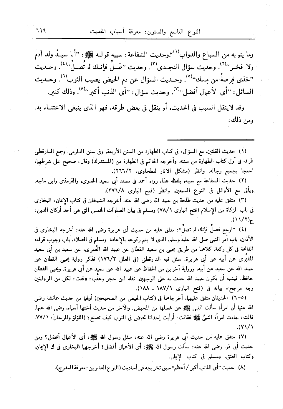 وما ينوبه من السباع والدواب (1) ". وحديث الشفاعة: سببه قوله - صلى الله عليه وسلم -: " أنا سيدُ ولد آدم ولا فخر " (2). وحديث سؤال النجدي (3). وحديث " صَلِّ فإنك لم تُصلِّ " (4). وحديث " خذي فِرصةً من مِسك " (5). وحديث السؤال عن دم الحيض يصيب الثوب (6). وحديث السائل: " أي الأعمال أفضل " (7). وحديث سؤال: " أي الذنب أكبر " (8). وذلك كثير.