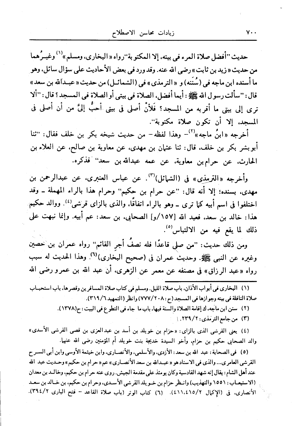 ومن ذلك حديث: " من صلى قاعدًأ فله نصفُ أجرِ القائم " رواه عمران بن حصين وغيره عن النبي - صلى الله عليه وسلم -. وحديث عمران في (صحيح البخاري) (6). وهذا الحديث له سبب رواه " عبدالرزاق " في مصنفه عن معمر عن الزهري، أن عبدالله بن عمرو - رضي الله