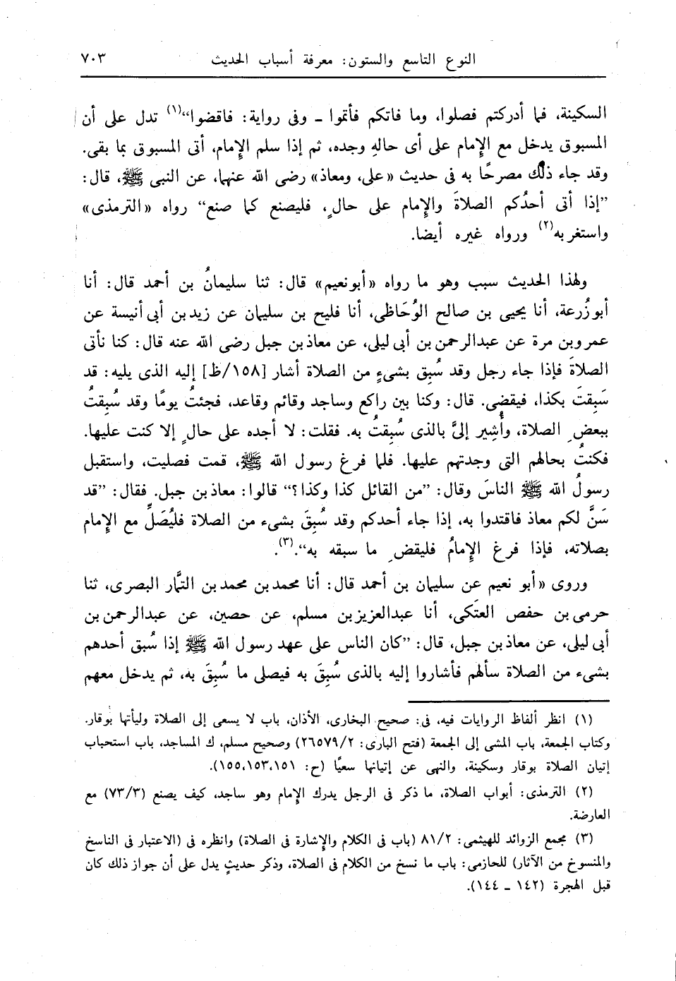 ولهذا الحديث سبب وهو ما رواه " أبو نعيم " قال: ثنا سليمانُ بن أحمد قال: أنا أبو زرعة، أنا يحيى بن صالح الوُحَاظي، أنا فليح بن سليمان عن زيد بن أبي أنيسة عن عمرو بن مرة عن عبدالرحمن بن أبي ليلى، عن معاذ بن جبل - رضي الله عنه - قال: كنا نأتي الصلاةَ فإذا جاء رجل وقد سُبِق بشيءٍ من الصلاة أشار [158 / ظ] إليه الذي يليه: قد سُبِقتَ بكذا، فيقضي. قال: وكنا بين راكع وساجد وقائم وقاعد، فجئتُ يومًا وقد سُبِقتُ ببعض ِ الصلاة، وأُشِير إليَّ بالذي سُبِقتُ به. فقلت: لا أجده على حال ٍ إلا كنت عليها. فكنتُ بحالهم التي وجدتهم عليها. فلما فرغ رسول الله - صلى الله عليه وسلم -، قمت فصليت، واستقبل رسولُ الله - صلى الله عليه وسلم - الناسَ وقال: " من القائل كذا وكذا؟ " قالوا: معاذ بن جبل. فقال: " قد سَنَّ لكم معاذ فاقتدوا به، إذا جاء أحدكم وقد سُبِقَ بشيء من الصلاة فليُصَلِّ مع الإمام بصلاته، فإذا فرغ الإمامُ فليقض ِ ما سبقه به " (3).