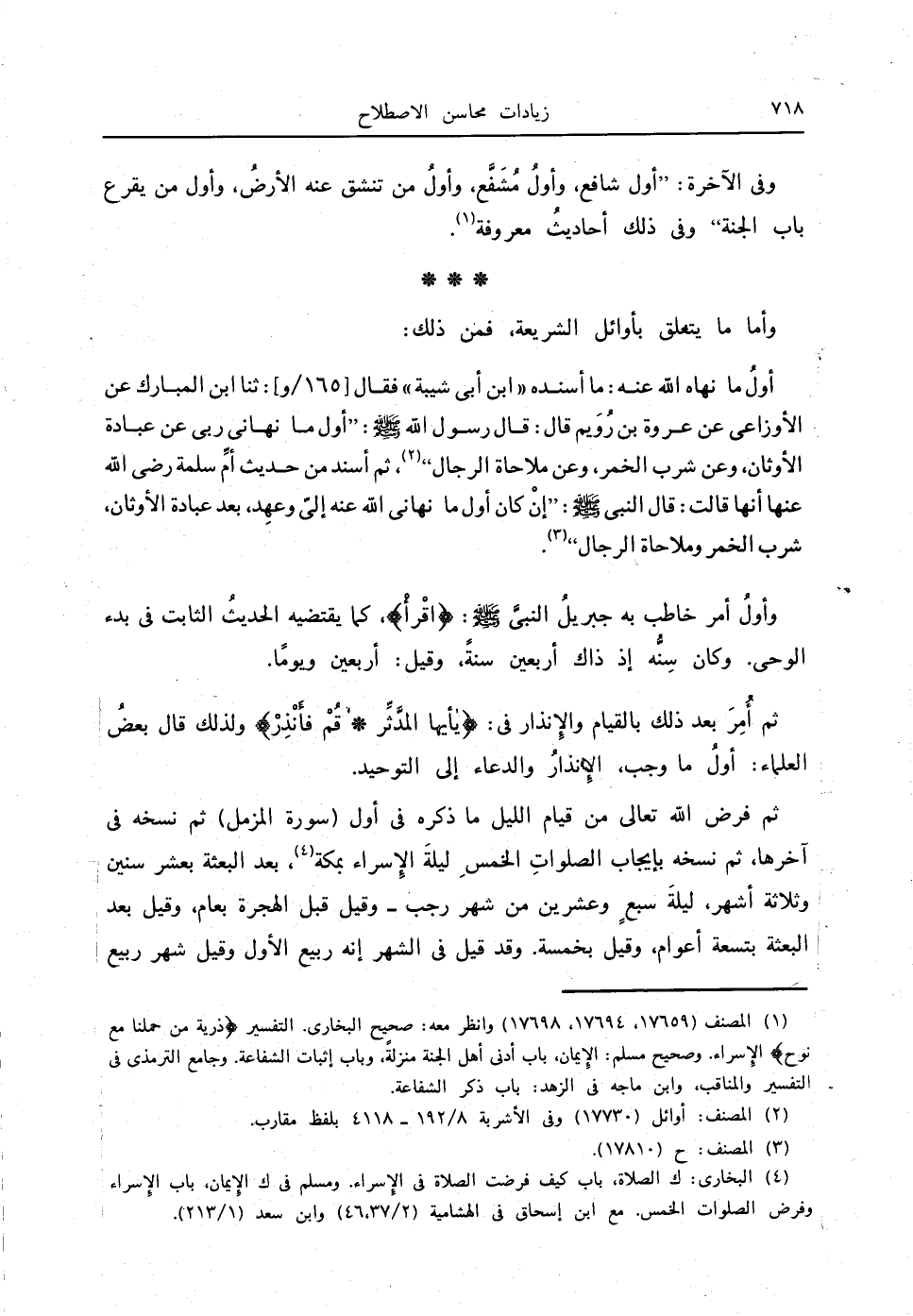 ثم فرض الله تعالى من قيام الليل ما ذكره في أول (سورة المزمل) ثم نسخه في آخرها، ثم نسخه بإيجاب الصلواتِ الخمس ِ ليلة الإسراء بمكة (4)، بعد البعثة بعشر سنين وثلاثة أشهر، ليلةَ سبع ٍ وعشرين من شهر رجب - وقيل قبل الهجرة بعام، وقيل بعد البعثة بتسعة أعوام، وقيل بخمسة. وقد قيل في الشهر إنه ربيع الأول وقيل شهر ربيع
