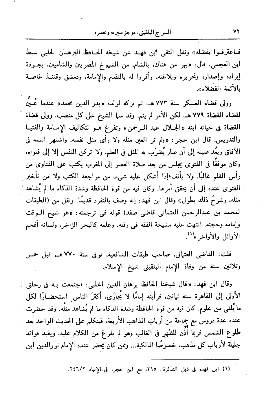 قلت: القاضي العثماني، صاحب الطبقات الشافعية، توفي سنة 770 هـ، قبل خمس وثلاثين سنة من وفاة الإِمام البلقيني شيخ الإِسلام.