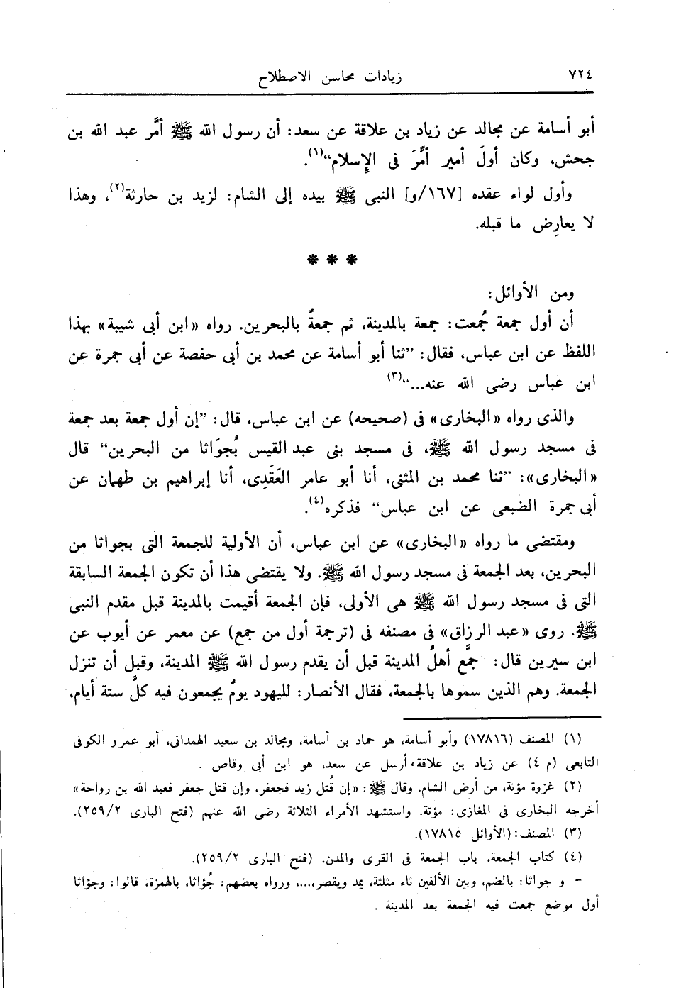 ومقتضى ما رواه " البخاري " عن ابن عباس، أن الأولية للجمعة التي بجواثا من البحرين، بعد الجمعة في مسجد رسول الله - صلى الله عليه وسلم -، ولا يقتضي هذا أن تكون الجمعة السابقة التي في مسجد رسول الله - صلى الله عليه وسلم - هي الأولى؛ فإن الجمعة أقيمت بالمدينة قبل مقدم النبي - صلى الله عليه وسلم -. روى " عبدالرزاق " في مصنفه في (ترجمة أول من جمع) عن معمر عن أيوب عن ابن سيرين قال: جمَّع أهلُ المدينة قبل أن يقدم رسول الله - صلى الله عليه وسلم - المدينة، وقبل أن تنزل الجمعة. وهم الذين سموها بالجمعة، فقال الأنصار: لليهود يومٌ يجمعون فيه كلَّ ستة أيام،