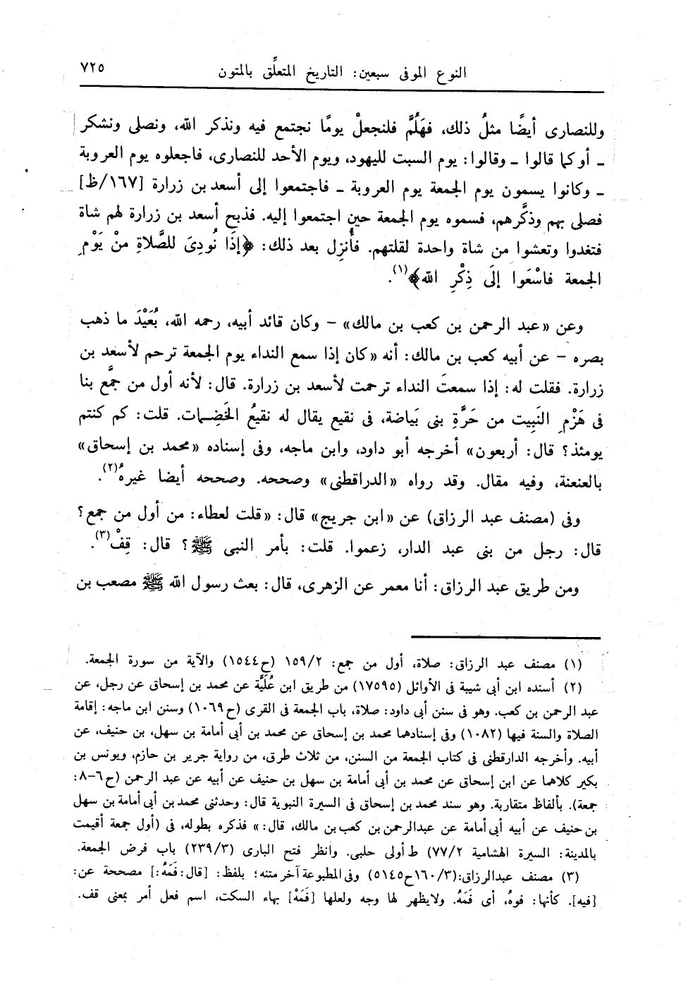 وللنصارى أيضًا مثلُ ذلك، فهَلُمَّ فلنجعلْ يومًا نجتمع فيه ونذكر الله، ونصلي ونشكر - أو كما قالوا - وقالوا: يوم السبت لليهود، ويوم الأحد للنصارى، فاجعلوه يوم العروبة - وكانوا يسمون يوم الجمعة يوم العروبة - فاجتمعوا إلى أسعد بن زرارة [167 / ظ] فصلى بهم وذكَّرهم، فسموه يوم الجمعة حين اجتمعوا إليه. فذبح أسعد بن زرارة لهم شاة فتغدوا وتعشوا من شاة واحدة لقلتهم. فأُنزِل بعد ذلك: " إِذَا نُودِيَ لِلصَّلَاةِ مِنْ يَوْمِ الْجُمُعَةِ فَاسْعَوْا إِلَى ذِكْرِ اللَّهِ " (1).