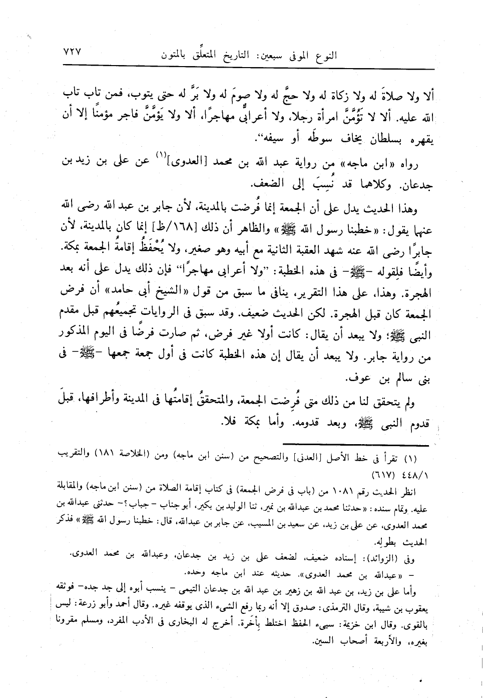 وهذا الحديث يدل على أن الجمعة إنما فُرضت بالمدينة؛ لأن جابر بن عبدالله - رضي الله عنهما - يقول: " خطبنا رسول الله - صلى الله عليه وسلم - " والظاهر أن ذلك [168 / ظ] إنما كان بالمدينة؛ لأن جابرًا - رضي الله عنه - شهد العقبة الثانية مع أبيه وهو صغير، ولا يُحْفَظُ إقامةُ الجمعة بمكة. وأيضًا فلِقوله - صلى الله عليه وسلم - في هذه الخطبة: " ولا أعرابي مهاجرًا " فإن ذلك يدل على أنه بعد الهجرة. وهذا، على هذا التقرير، ينافي ما سبق من قول " الشيخ أبي حامد " أن فرض الجمعة كان قبل الهجرة. لكن الحديث ضعيف، وقد سبق في الروايات تجميعُهم قبل مقدم النبي - صلى الله عليه وسلم -، ولا يبعد أن يقال: كانت أولا غير فرض، ثم صارت فرضًا في اليوم المذكور من رواية جابر. ولا يبعد أن يقال إن هذه الخطبة كانت في أول جمة جمعها - صلى الله عليه وسلم - في بني سالم بن عوف.