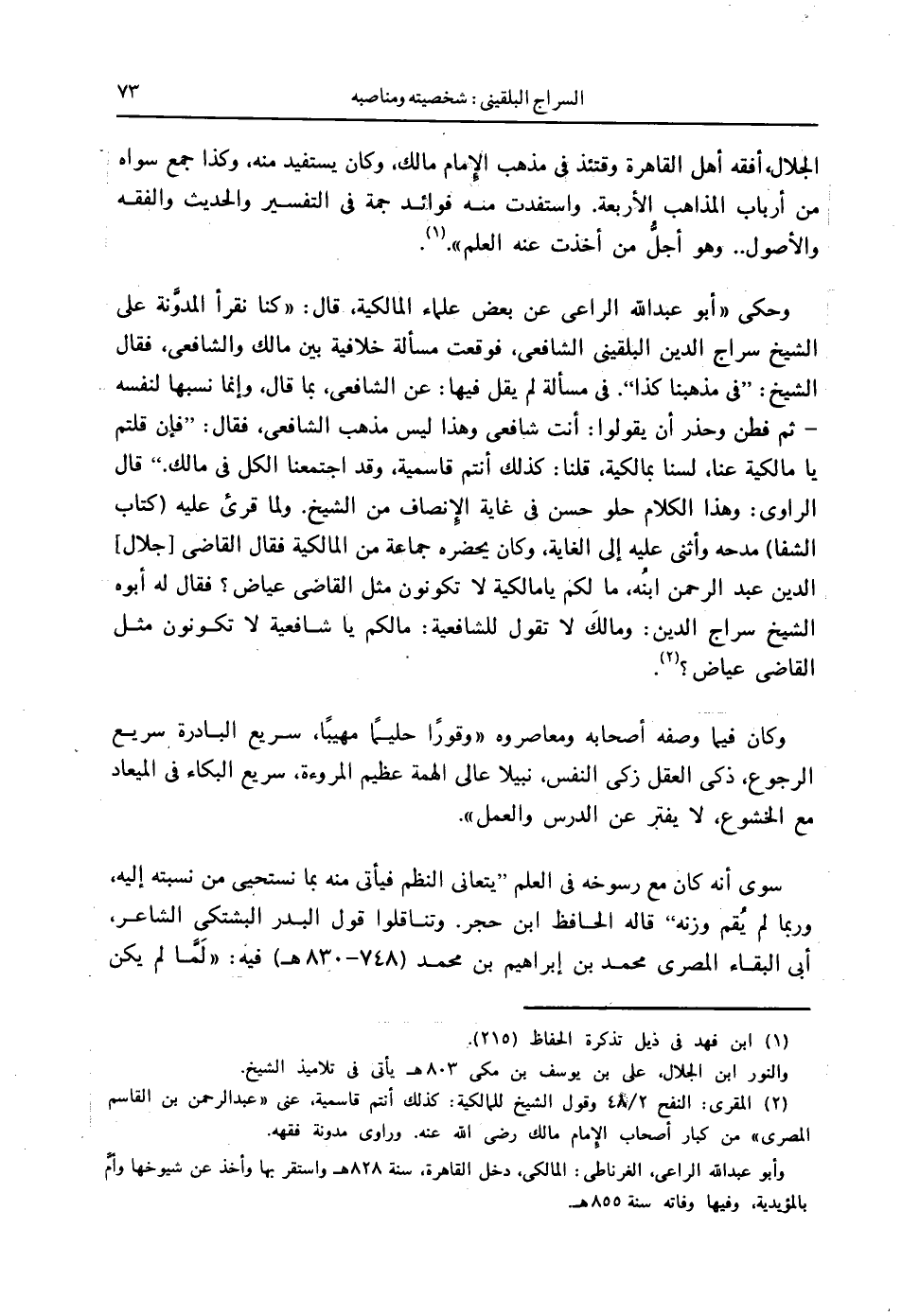 الجلال، أفقه أهل القاهرة وقتئذ في مذهب الإِمام مالك، وكان يستفيد منه، وكذا جمع سواه من أرباب المذاهب الأربعة. واستفدت منه فوائد جمة في التفسير والحديث والفقه والأصول .. وهو أجلُّ من أخذت عنه العلم " (1).