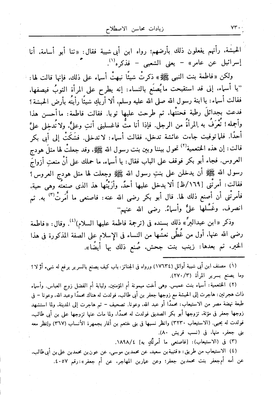 وذكر " ابن عبد البرِّ " ذلك بسنده في (ترجمة فاطمة - عليها السلام -) (4). وقال: " فاطمة - رضي الله عنها -، أول من غُطِّي نعشُها من النساء في الإسلام على الصفة المذكورة في هذا الخبر، ثم بعدها: زينب بنت جحش، صُنع ذلك بها أيضًا ".