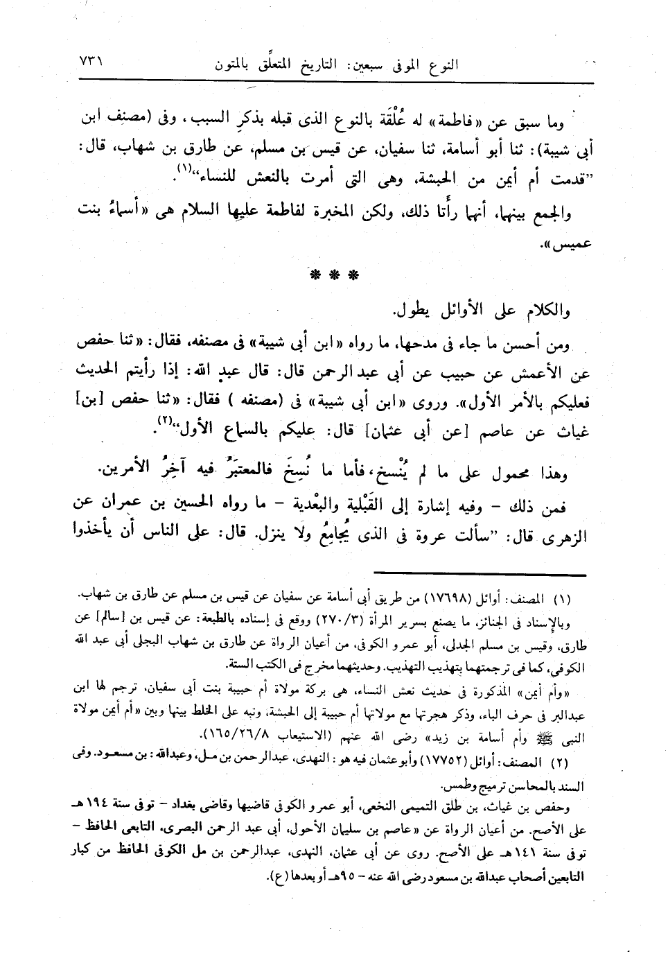 ومن أحسن ما جاء في مدحها، ما رواه " ابن أبي شيبة " في مصنفه، فقال: " ثنا حفص عن الأعمش عن حبيب عن أبي عبدالرحمن قال: قال عبدالله: إذا رأيتم الحديث فعليكم بالأمر الأول ". وروى " ابن أبي شيبة " في (مصنفه) فقال: " ثنا حفص [بن] غياث عن عاصم [عن أبي عثمان] قال: عليكم بالسماع الأول " (2).