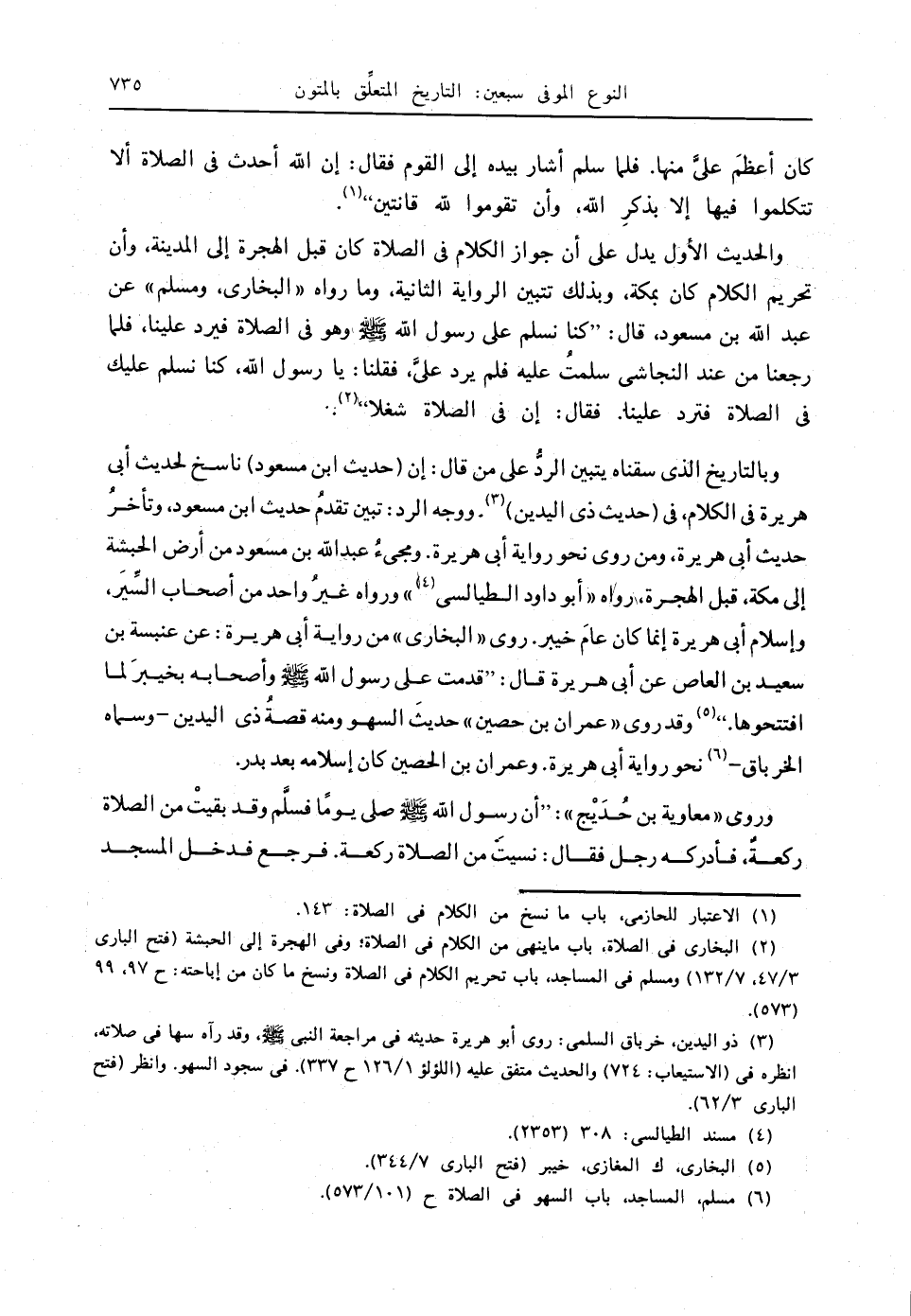 وبالتاريخ الذي سقناه يتبين الردُّ على من قال: إن (حديث ابن مسعود) ناسخ لحديث أبي هريرة في الكلام، في (حديث ذي اليدين) (3). ووجه الرد: تبين تقدمُ حديث ابن مسعود، وتأخرُ حديث أبي هريرة، ومن روى نحو رواية أبي هريرة. ومجيءُ عبدالله بن مسعود من أرض الحبشة إلى مكة، قبل الهجرة؛ رواه " أبو داود الطيالسي (4) " ورواه غيرُ واحد من أصحاب السِّيَر، وإسلام أبي هريرة إنما كان عامَ خيبر. روى " البخاري " من رواية أبي هريرة: عن عنبسة بن سعيد بن العاص عن أبي هريرة قال: " قدمت على عهد رسول الله - صلى الله عليه وسلم - وأصحابه بخيبرَ لما افتتحوها " (5). وقد روى " عمران بن حصين " حديثَ السهو ومنه قصةُ ذي اليدين - وسماه الخرباق - (6) نحو رواية أبي هريرة. وعمران بن الحصين كان إسلامه بعد بدر.