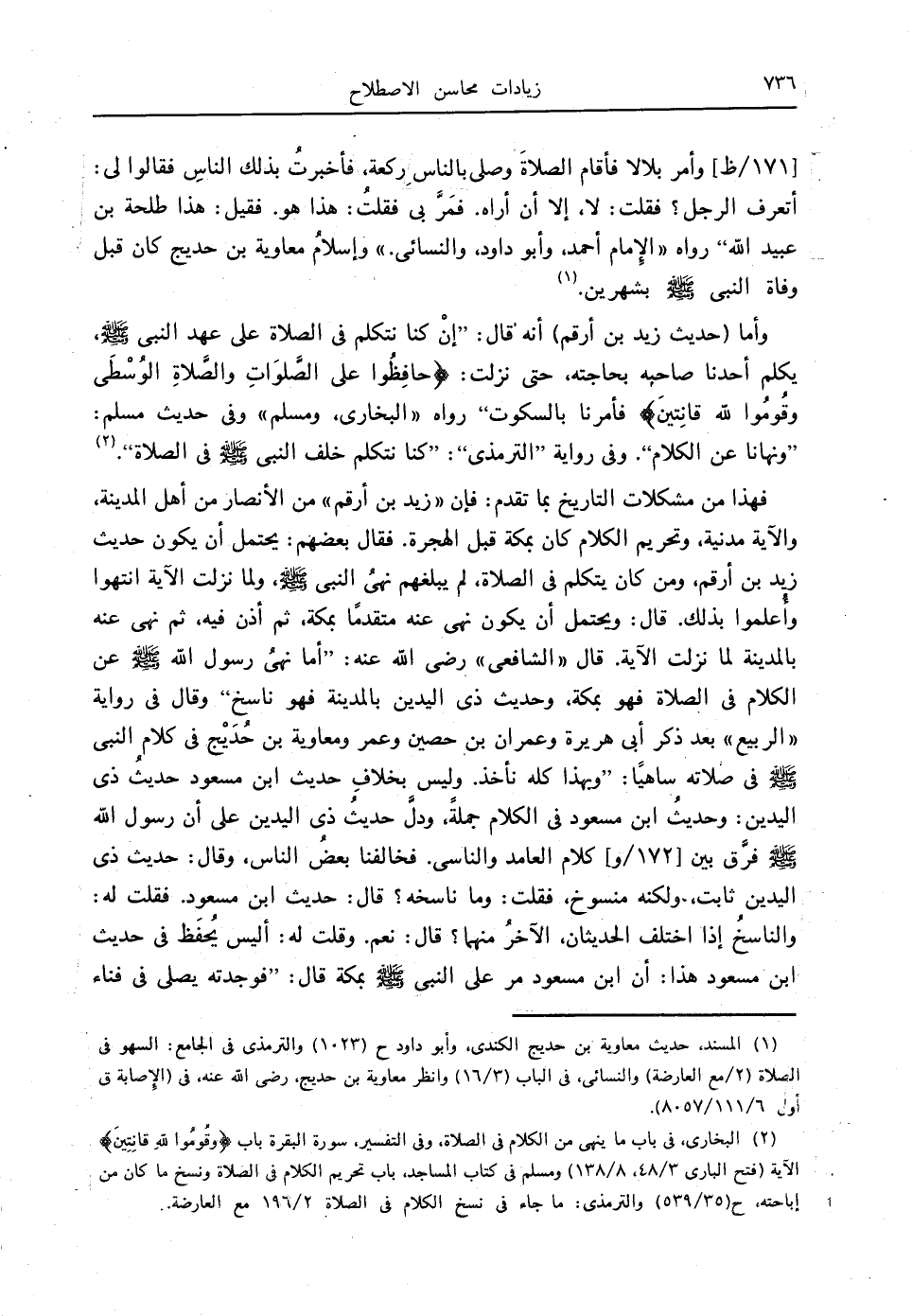 (2) البخاري، في باب ما ينهى من الكلام في الصلاة، سورة البقرة، باب: " وَقُومُوا لِلَّهِ قَانِتِينَ " الآية (فتح الباري 3/ 48، 8/ 138) ومسلم في كتاب المساجد، باب تحريم الكلام في الصلاة ونسخ ما كان من إباحته، ح (35/ 539) والترمذي: ما جاء في نسخ الكلام في الصلاة 2/ 196 مع العارضة.