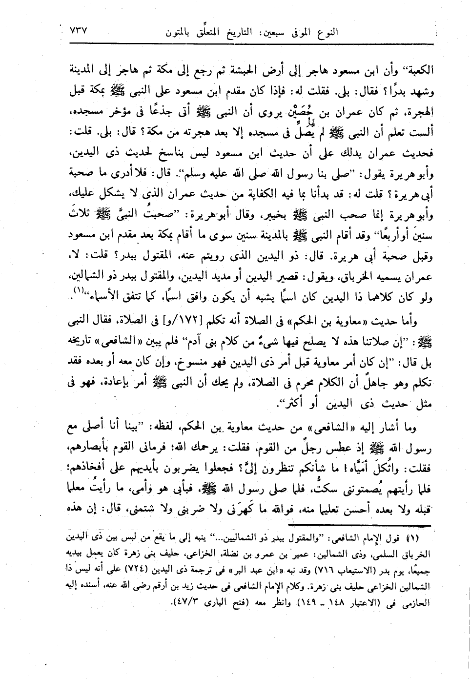 الكعبة " وأن ابن مسعود هاجر إلى أرض الحبشة ثم رجع إلى مكة ثم هاجر إلى المدينة وشهد بدرًا؟ فقال: بلى. فقلت له: فإذا كان مقدم ابن مسعود على النبي - صلى الله عليه وسلم - بمكة قبل الهجرة، ثم كان عمران بن حُصَيْن يروي أن النبي - صلى الله عليه وسلم - أتى جذعًا في مؤخر مسجده، ألست تعلم أن النبي - صلى الله عليه وسلم - لم يُصَلِّ في مسجده إلا بعد هجرته من مكة؟ قال: بلى. قلت: فحديث عمران يدلك على أن حديث ابن مسعود ليس بناسخ لحديث ذي اليدين، وأبو هريرة يقول: " صلى بنا رسول الله - صلى الله عليه وسلم - ". قال: فلا أدري ما صحبة أبي هريرة؟ قلت له: قد بدأنا بما فيه الكفاية من حديث عمران الذي لا يشكل عليك، وأبو هريرة إنما صحب النبي - صلى الله عليه وسلم - بخيبر، وقال أبو هريرة: " صحبتُ النبي - صلى الله عليه وسلم - ثلاثَ سنينَ أو أربعًا " وقد أقام النبي - صلى الله عليه وسلم - بالمدينة سنين سوى ما أقام بمكة بعد مقدم ابن مسعود وقبل صحبة أبي هريرة. قال: ذو اليدين الذي رويتم عنه، المقتول ببدر؟ قلت: لا، عمران يسميه الخرباق، ويقول: قصير اليدين أو مديد اليدين، والمقتول ببدر ذو الشمالين، ولو كان كلاهما ذا اليدين كان اسمًا يشبه أن يكون وافق اسمًا، كما تتفق الأسماء " (1).