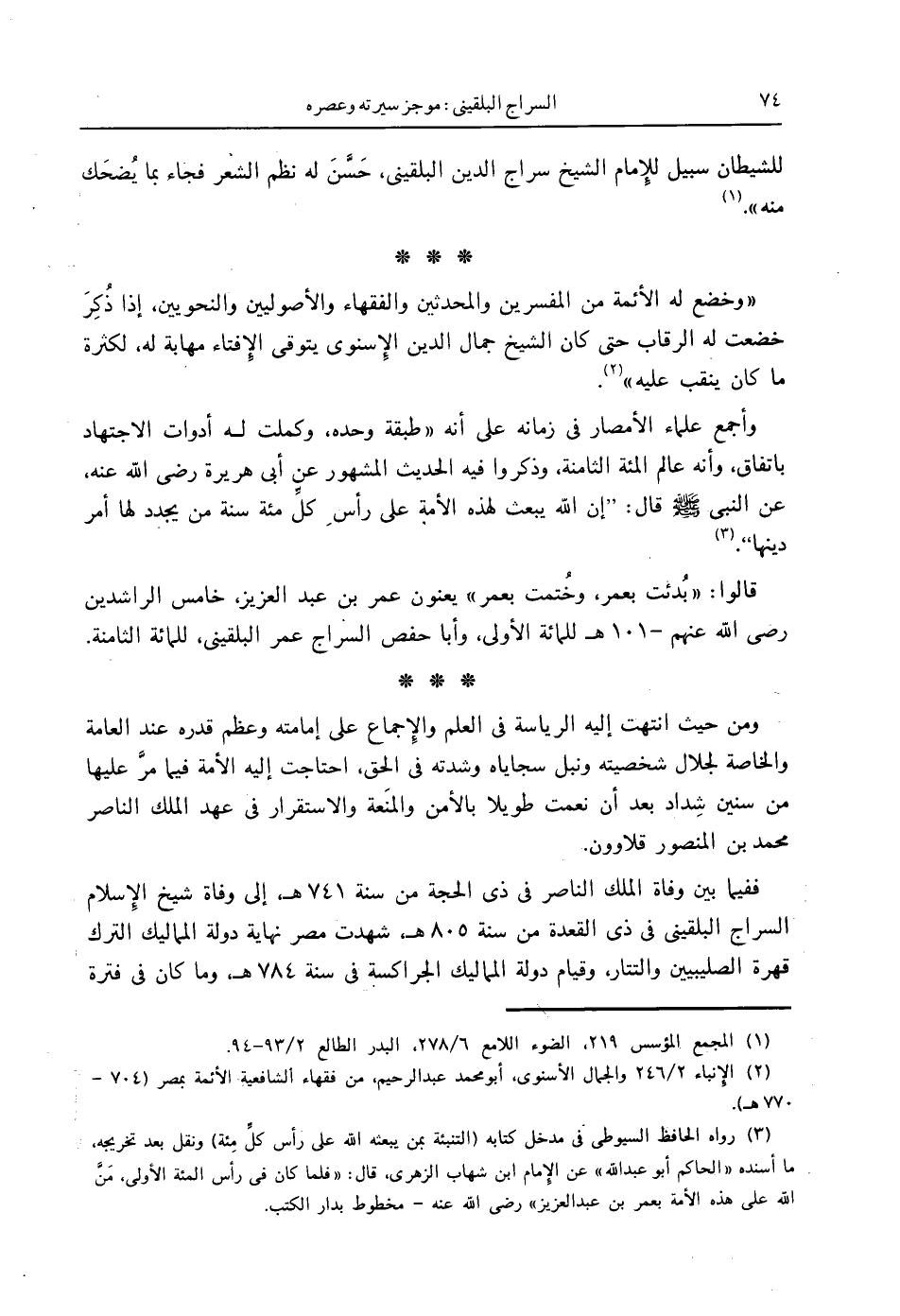 (3) رواه الحافظ السيوطي في مدخل كتابه (التنبئة بمن يبعثه الله على رأس كلِّ مِئة) ونقل بعد تخريجه ما أسنده " الحاكم أبو عبدالله " عن الإِمام ابن شهاب الزهري، قال: " فلما كان في رأس المئة الأولى، مَنَّ الله على هذه الأمة بعمر بن عبدالعزيز " رضي الله عنه - مخطوط بدار الكتب.
