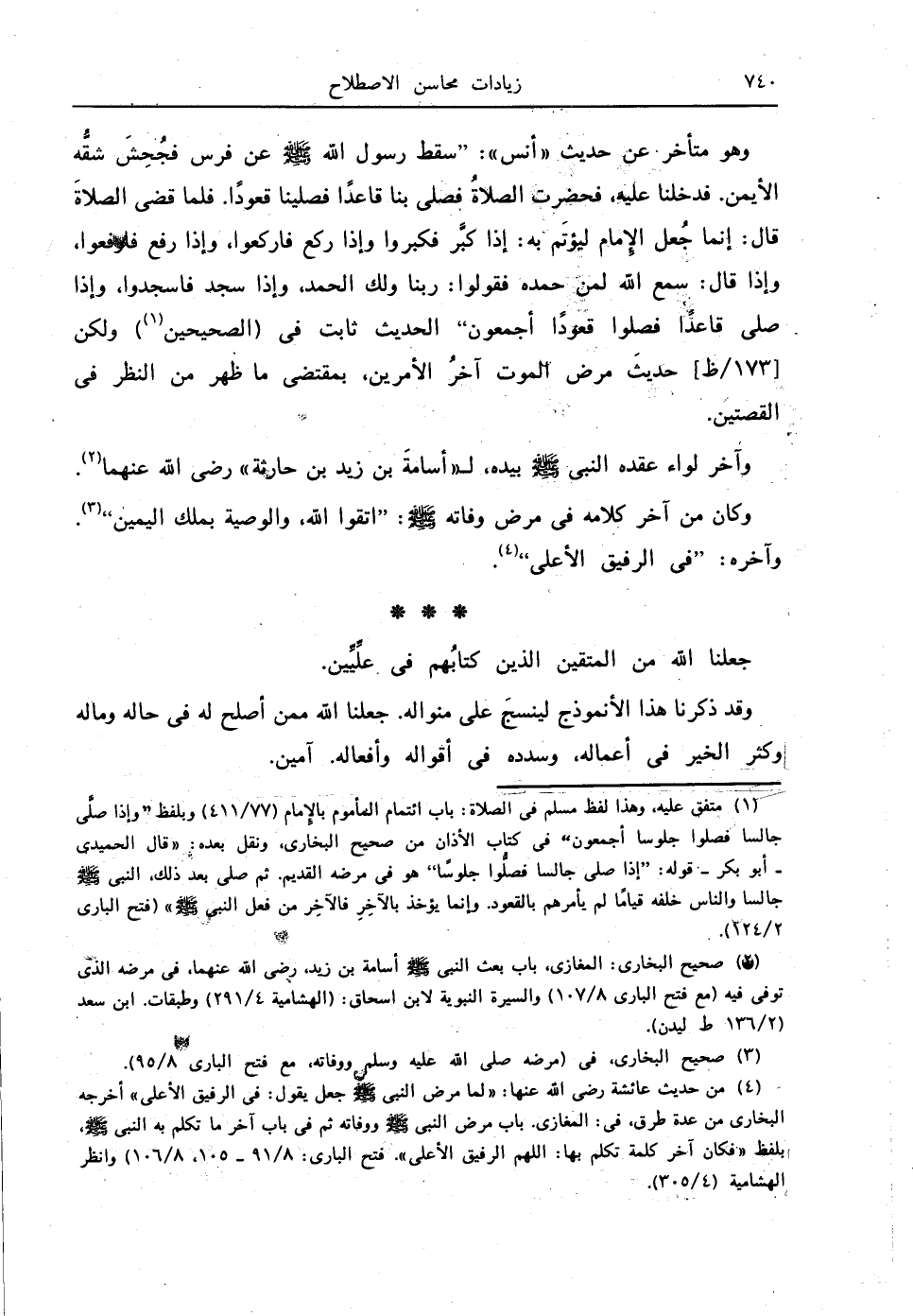 (4) من حديث عائشة - رضي الله عنها -: " لما مرض النبي - صلى الله عليه وسلم - جعل يقول: في الرفيق الأعلى " أخرجه البخاري من عدة طرق، في: المغازي، باب مرض النبي - صلى الله عليه وسلم - ووفاته ثم في باب آخر ما تكلم به النبي - صلى الله عليه وسلم -، بلفظ " فكان آخر كلمة تكلم بها: اللهم الرفيق الأعلى " (فتح الباري: 8/ 91 - 105، 8/ 106) وانظر الهشامية (4/ 305).