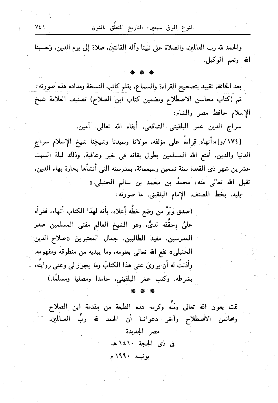 تمت بعون الله تعالى ومَنِّه وكرمه هذه الطبعة من مقدمة ابن الصلاح ومحاسن الاصطلاح وآخر دعوانا أن الحمد لله ربِّ العالمين.