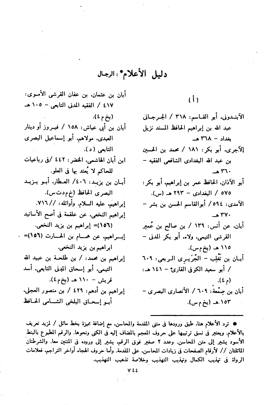 * ترد الأعلام هنا، طبق ورودها في متني المقدمة والمحاسن، مع إضافة مميزة بخط مائل / لمزيد تعريف بالأعلام. ويعتبر في نسق ترتيبها على حروف المعجم بالمضاف إليه في الكنى ونحوها. والرقم المطبوع بالبنط الأسود يشير إلى متن المحاسن. وعدد 2 صغير فوق الرقم، يشير إلى وروده في المتنين معا. والشرطتان المائلتان // لأرقام الصفحات في زيادات المحاسن، على المقدمة. وأما حروف الهجاء أواخر التراجم؛ فعلامات الرواة في تهذيب الكمال وتهذيب التهذيب وخلاصة تذهيب التهذيب.