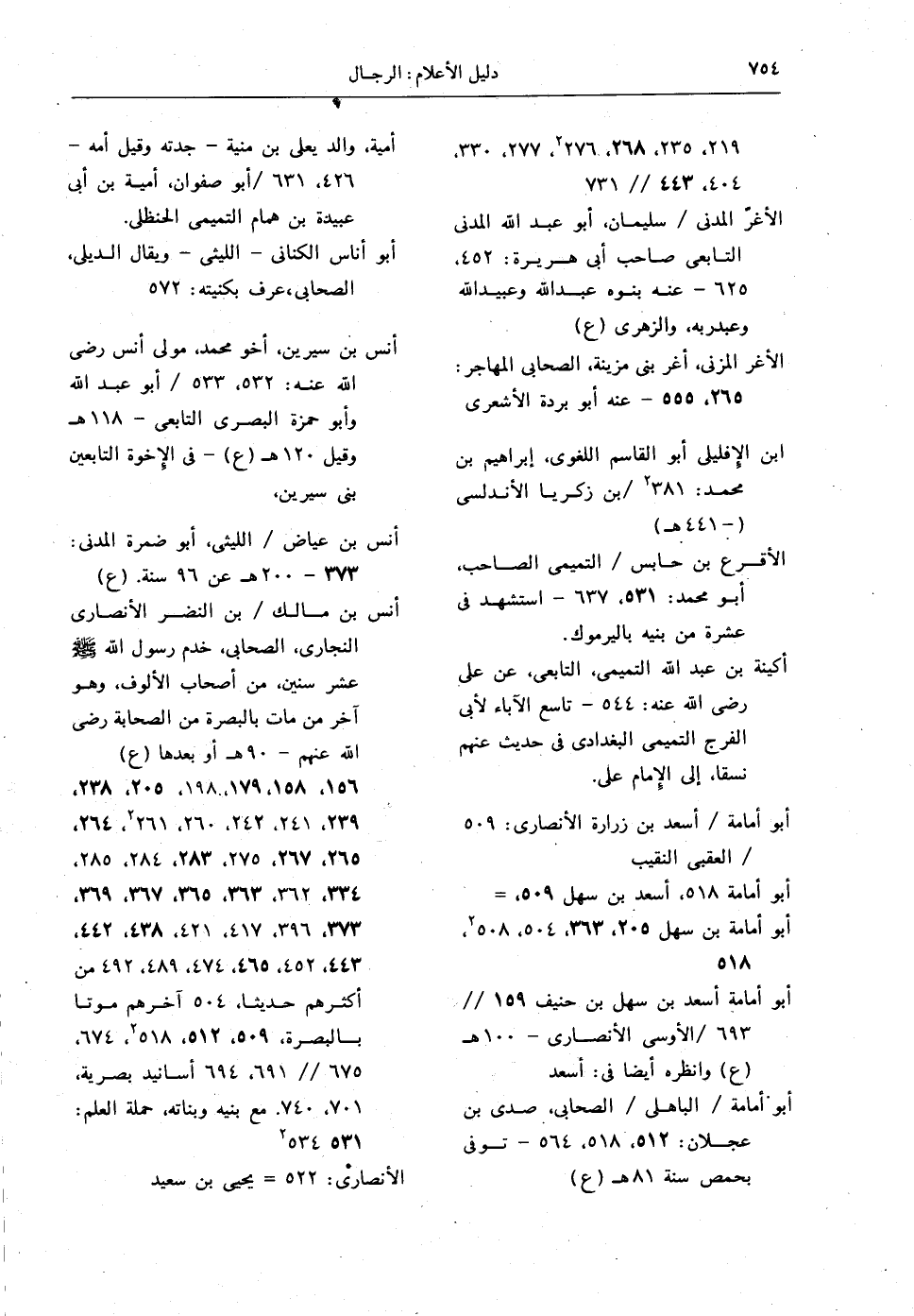 أنس بن مالك / بن النضر الأنصاري النجاري، الصحابي، خدم رسول الله - صلى الله عليه وسلم - عشر سنين، من أصحاب الألوف، وهو آخر من مات بالبصرة من الصحابة - رضي الله عنهم - 90 هـ أو بعدها (ع) 156، 158، 179، 198، 205، 238، 239، 241، 242، 260، 261 ²، 264، 265، 267، 275، 283، 284، 285، 334، 362، 363، 365، 367، 369، 373، 396، 417، 421، 438، 442، 443، 452، 465، 474، 489، 492 من أكثرهم حديثا، 504 آخرهم موتا بالبصرة، 509، 512، 518 ²، 674، 675 // 691، 694 أسانيد بصرية، 701، 740، مع بنيه وبناته، حملة العلم: 531، 534 ².