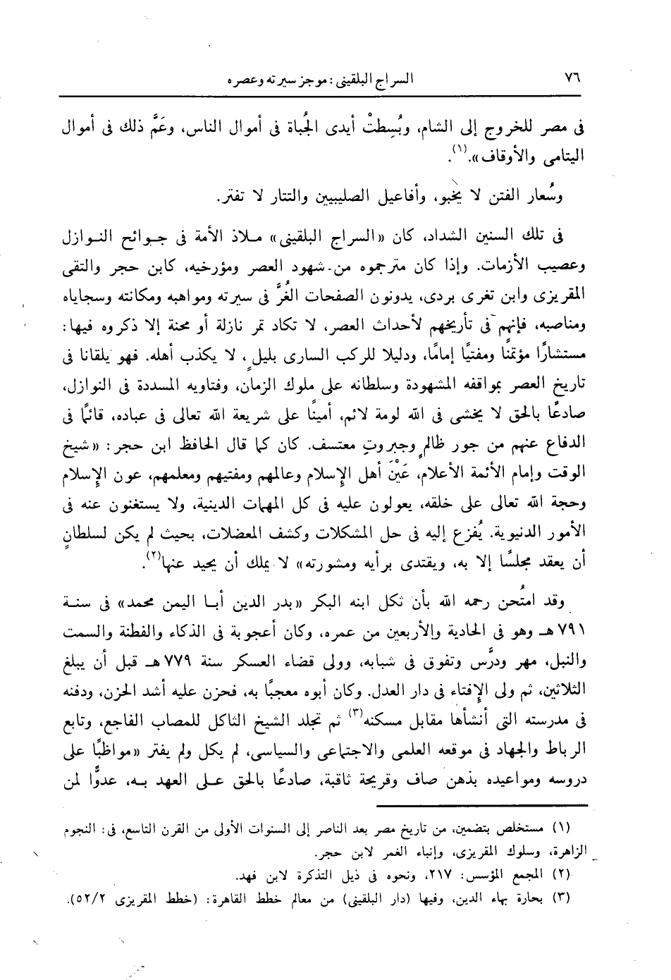 في تلك السنين الشداد، كان " السراج البلقيني " ملاذ الأمة في جوائح النوازل وعصيب الأزمات. وإذ كان مترجموه من شهود العصر ومؤرخيه، كابن حجر والتقي المقريزي وابن تغري بردي، يدونون الصفحات الغُرَّ في سيرته ومواهبه ومكانته وسجاياه ومناصبه، فإنهم في تأريخهم لأحداث العصر، لا تكاد تمر نازلة أو محنة إلا ذكروه فيها: مستشارًا مؤتمنًا ومفتيًا إمامًا، ودليلا للركب الساري بليل ٍ، لا يكذب أهله. فهو يلقانا في تاريخ العصر بموافقة المشهودة وسلطانه على ملوك الزمان، فتاويه المسددة في النوازل، صادعًا بالحق لا يخشى في الله لومة لائم، أمينًا على شريعة الله تعالى في عباده، قائمًا في الدفاع عنهم من جور ظالم ٍ وجبروتِ متعسف. كان كما قال الحافظ ابن حجر: " شيخ الوقت وإمام الأئمة الأعلام، عَيْنَ أهل الإِسلام وعالمهم ومفتيهم ومعلمهم، عون الإِسلام وحجة الله تعالى على خلقه، يعولون عليه في كل المهمات الدينية، ولا يستغنون عنه في الأمور الدينية. يُفزع إليه في حل المشكلات وكشف المعضلات، بحيث لم يكن لسلطانٍ أن يعقد مجلسًا إلا به، ويقتدي برأيه ومشورته " لا يملك أن يحيد عنها (2).