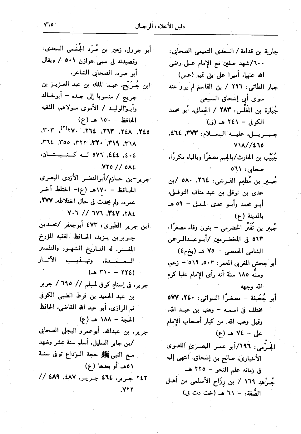 جرير، بن عبد الله، أبو عمرو البجلي الصحابي / بن جابر السليل، أسلم سنة عشر وشهد مع النبي - صلى الله عليه وسلم - حجة الوداع، توفي سنة 51 هـ أو بعدها (ع) 242 جرير، 464، جرير، 487، 489 // 722.