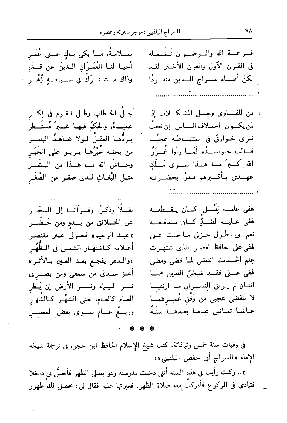 في وفيات سنة خمس وثمانمائة، كتب شيخ الإِسلام الحافظ ابن حجر، في ترجمة شيخه الإِمام " السراج أبي حفص البلقيني ":